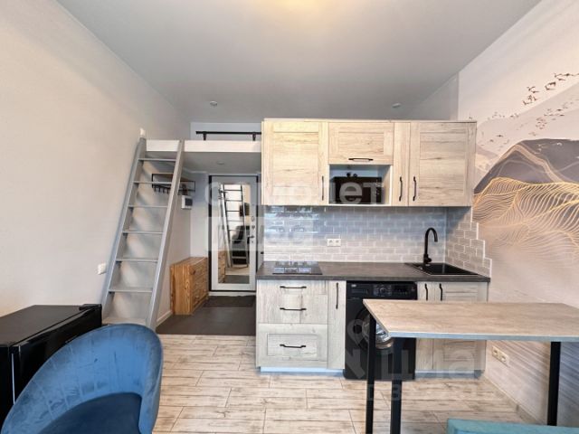 В студии 3 окна, в т ч в ванной. Совмещённый санузел оборудован всем необходимым. Есть второй спальный уровень 5 кв.м. Уютная светлая кухня со встроенной бытовой техникой,
