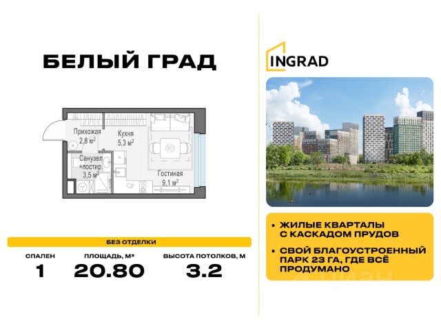 Прямая продажа от девелопера. В жилом квартале комфорт-класса "Белый Град" (девелопер ingrad) продаётся студия площадью 20.80 кв.м без отделки. Квартира расположена на 20 этаже 20-этажного дома, корпус 12.2. Расположение: "Белый Град" расположен в благоприятном северном направлении Москвы: в комфортной близости ко всем ее возможностям. Вы будете жить в заповедном месте с благородной историей и красивой природой. Исторически у слияния двух рек - Сукромки и Яузы - на возвышении располагалось село Тайнинское. На протяжении веков оно было облюбовано царями и великими князьями. Белокаменный храм, которым вы будете любоваться в окнах своего нового дома, - уникальный памятник русского зодчества. Отличная транспортная доступность: Новый микрорайон находится в 1 км от МКАД и 500 м от Осташковского шоссе. Добраться до столицы можно не только на автомобиле: сеть общественного транспорта в районе квартала активно развивается и дополняется новыми маршрутами: 35 минут до метро "Медведково", 38 минут до ж/д станции "Мытищи". Особенности комплекса и благоустройство: Вы будете жить в заповедном месте с благородной историей на берегу реки Сукромки. Почти 40% площади квартала занимает благоустроенная природная территория. У каждого из трех кварталов своё тематическое наполнение. Функциональная насыщенность территории многообразна: сенсорные площадки и песочницы для малышей, отдельные развивающие игровые зоны для детей от 3 до 5 и от 5 до 11 лет, игровые зоны для подростков. Отдельный парк для тренировки и выгула собак. Зона воркаута с современными тренажерами и многофункциональные спортивные площадки для командных видов спорта, поляны для йоги, навесы с зонами для тихого отдыха, веломаршрут протяженностью более 5 километров. Социальная инфраструктура многогранна: включает 4 детских сада, две школы, поликлинику и физкультурно-оздоровительный комплекс с бассейном, торговый центр и 2 административно-офисных здания. Открытые многоуровневые паркинги по периферии кварталов и паркинг в стилобатной части освободят дворы от машин, велопарковки позволят не заставлять красивые холлы Стоимость квартиры - 6 680 000 Р. Срок сдачи - 3 квартал 2026. Более подробную информацию по объекту уточняйте по телефону и в отделе продаж.
