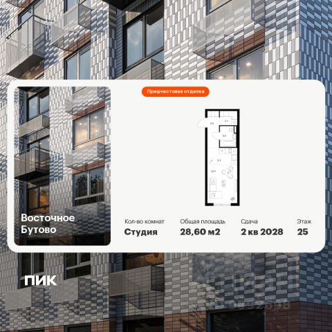 Продаётся квартира-студия площадью 28,6 кв.м на 25 этаже 25 этажного дома (Корпус 55, Секция 1) проекта ПИК Восточное Бутово. Светлый просторный подъезд на уровне земли, функциональная планировка, большие окна, предчистовая отделка. Жилой квартал "Восточное Бутово" расположен в 5 км от МКАД по Симферопольскому шоссе, в Ленинском районе Московской области. Это экологически благоприятное место по соседству с Бутовским лесопарком. В 25 минутах на машине - станции метро и МЦД "Бутово". В "Восточном Бутово" уже открылись пять детских садов из десяти запланированных и одна школа из четырёх. Внутри квартала будет две поликлиники, одна из которых уже работает. В проекте два пешеходных бульвара - по одному из них уже можно гулять и кататься на велосипеде. В закрытых дворах-парках не будет автомобилей - мы построим многоуровневый паркинг, чтобы сделать район ещё более комфортным и безопасным для жителей. Артикул 1044351 (Застройщик ООО "Лотан")