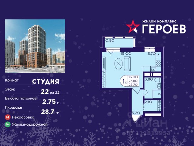 Продаётся студия 25.10 кв. м. в жилом комплексе "Героев" в Балашихе, Железнодорожный. Квартира расположена на 17 этаже 410 корпуса. В наличии квартиры с отделкой. Всего 40 минут до центра Москвы. При покупке квартиры в сданном доме ключи выдаются сразу! Жилой квартал "Героев" - это уютный проект для семей с детьми. В квартале созданы все условия для досуга всех возрастов: игровые и спортивные площадки, места для отдыха и прогулочные зоны. За 15 минут можно дойти от дома до Ольгинского лесопарка, популярного места для отдыха на свежем воздухе. На территории жилого комплекса уже открыт детский сад на 250 мест и началось строительство еще одного - для 220 малышей, а также школы для 1320 учеников. Рядом работают магазины, кафе, супермаркеты, пункты выдачи. Преимущества: • В уютных светлых квартирах с просторными кухнями-гостиными удобно встречать гостей и проводить время наедине друг с другом. • Благодаря увеличенному остеклению в комнатах много света. • Квартиры продаются с отделкой, можно заселяться сразу после получения ключей.
