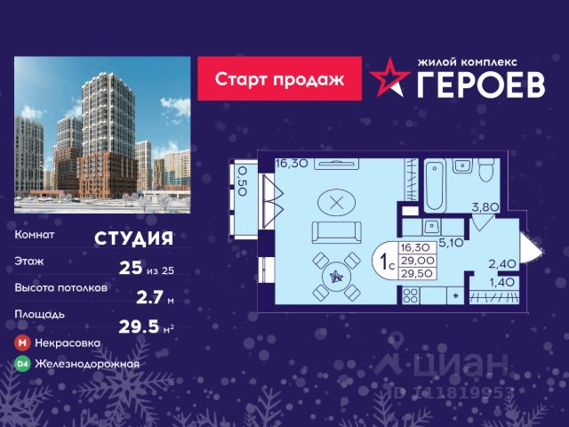 Продаётся студия 25.10 кв. м. в жилом комплексе "Героев" в Балашихе, Железнодорожный. Квартира расположена на 17 этаже 410 корпуса. В наличии квартиры с отделкой. Всего 40 минут до центра Москвы. При покупке квартиры в сданном доме ключи выдаются сразу! Жилой квартал "Героев" - это уютный проект для семей с детьми. В квартале созданы все условия для досуга всех возрастов: игровые и спортивные площадки, места для отдыха и прогулочные зоны. За 15 минут можно дойти от дома до Ольгинского лесопарка, популярного места для отдыха на свежем воздухе. На территории жилого комплекса уже открыт детский сад на 250 мест и началось строительство еще одного - для 220 малышей, а также школы для 1320 учеников. Рядом работают магазины, кафе, супермаркеты, пункты выдачи. Преимущества: • В уютных светлых квартирах с просторными кухнями-гостиными удобно встречать гостей и проводить время наедине друг с другом. • Благодаря увеличенному остеклению в комнатах много света. • Квартиры продаются с отделкой, можно заселяться сразу после получения ключей.