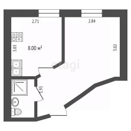 —функциональная планировка: комната с кухонной зоной и выходом на лоджию-ПАТИО, совмещённый санузел, прихожая. Площадь по ЕГРН — 27,4 кв. м. без учёта лоджии.