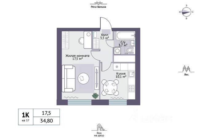Потолки: кухня, комната — натяжной потолок; коридор, санузел — натяжные или ГКЛ