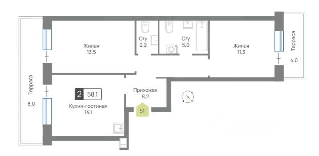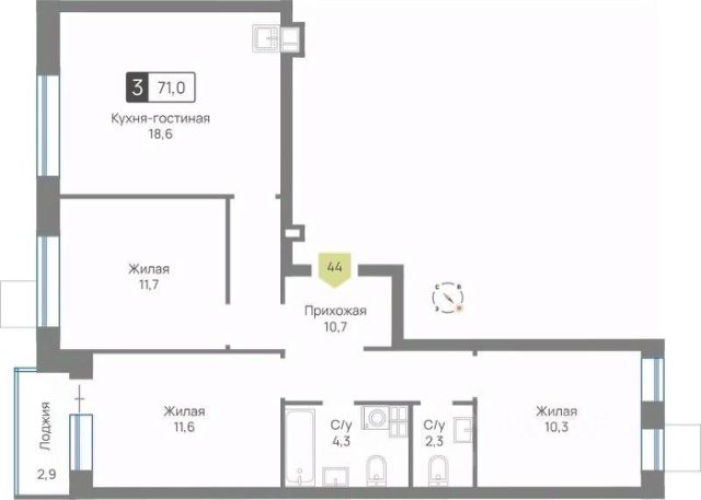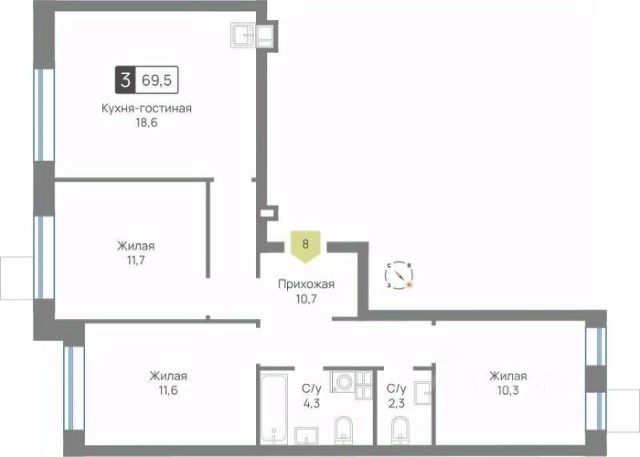 Общая площадь квартиры 80,85 метров, изолированные комнаты 18,5, 17,69 и 13,97 метров, кухня-гостиная 15,2 метров, то есть по факту это формат евро четыре. Два санузла.