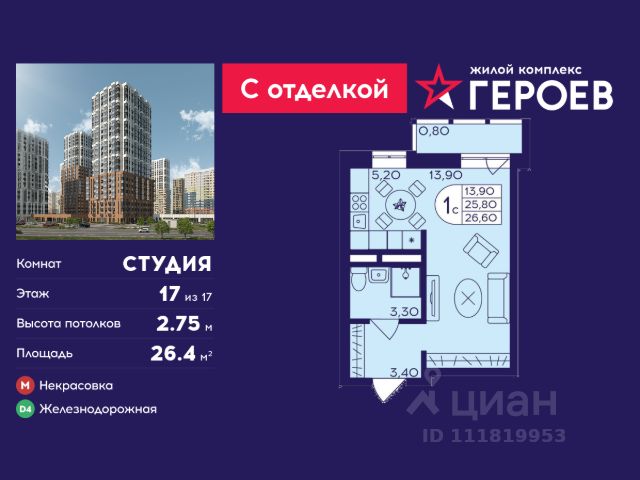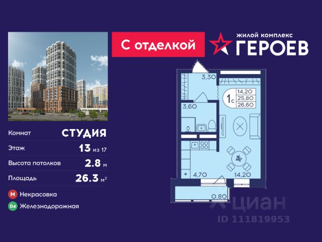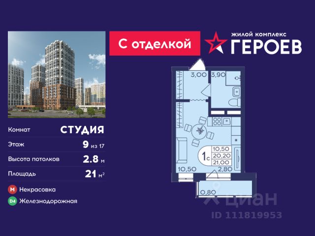 Продаётся студия 21 кв. м. в жилом комплексе "Героев" в Балашихе, Железнодорожный. Квартира расположена на 9 этаже 406 корпуса. Все квартиры представлены с чистовой отделкой. Вам не нужно тратить время и дополнительные финансы на ремонт или жить в шуме строительных работ - достаточно перевести свои вещи, расставить мебель и всё готово! Жилой квартал "Героев" - это уютный проект для семей с детьми. Всего 40 минут до центра Москвы. В квартале созданы все условия для досуга всех возрастов: игровые и спортивные площадки, места для отдыха и прогулок, магазины, кафе и пункты выдачи. За 15 минут можно дойти от дома до Ольгинского лесопарка - популярного места для прогулок и отдыха на свежем воздухе. Здесь приятно гулять всей семьёй, заниматься спортом или устроить пикник в выходной день. Преимущества: Квартира с готовой отделкой. Пространство полностью подготовлено для жизни: не нужно тратить время и деньги на ремонт или ждать его окончания. После получения ключей достаточно расставить мебель - и можно сразу заезжать и жить. Продуманные и светлые планировки. Просторные кухни-гостиные создают комфортное пространство для отдыха и встреч с близкими. В квартирах предусмотрены удобные гардеробные, благодаря чему легко поддерживать порядок и не перегружать комнаты шкафами. Увеличенное остекление. Большие окна наполняют квартиру естественным светом в течение всего дня, создавая ощущение простора и уюта, а также визуально расширяя пространство и делая интерьер более воздушным. Пешая доступность до станции Железнодорожная (МЦД-4) - дорога займёт не более 30 минут до центра Москвы: станции метро "Курская", "Площадь Ильича" или ТПУ Нижегородская.