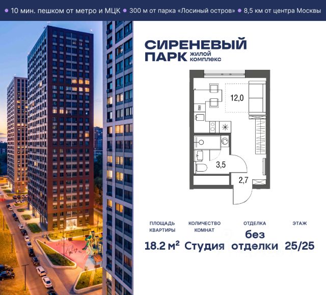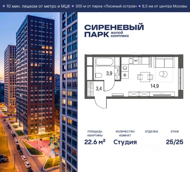 Продаётся просторная студия общей площадью 18.2 м² на 22 этаже в новом жилом комплексе "Сиреневый парк", расположенном в Восточном административном округе Москвы на улице Тагильская. Всего 10 минут ходьбы от станции метро "Бульвар Рокоссовского" и одноимённой платформы МЦК. Высококачественное монолитное строительство гарантирует сохранение тепла в доме, а наличие квартир с предчистовой и чистовой отделкой позволяет вам сэкономить время и сразу же переехать в свое жилье после покупки. Благодаря разнообразию планировок вы сможете выбрать идеальный вариант, соответствующий вашим предпочтениям и образу жизни. Предлагаются квартиры: - с просторными кухнями-гостиными, - с нишами для хранения вещей и отдельными гардеробными, - мастер-спальни с собственными санузлами, - большие комнаты с высокими потолками (2,9 м) и с увеличенными безопасными окнами (1,95 м) , которые наполнят ваш дом естественным светом; - с чистовой отделкой по двум дизайн-проектам на выбор; - с остекленными лоджиями и панорамными видами на лес. Каждая деталь в этом доме создана для вашего комфорта: - безбарьерная среда, - бесшумные скоростные лифты, - машиноместа в отапливаемом подземном паркинге и кладовые на -1 этаже с доступом из лифта, - развитая инфраструктура с супермаркетами, кафе, фитнес-клубами, салонами красоты и частным детским садом обеспечивает максимальное удобство жителям. В 300 метрах от ЖК расположен Национальный парк "Лосиный остров". Способы покупки: 100%, Рассрочка 0% от застройщика, Trade-in, Семейная ипотека без наценки, стандартная ипотека. Запишитесь на просмотр в офис продаж и получите свою персональную скидку по акции Назови свою скидку. ЖК "Сиреневый парк" — гармония в деталях, совершенство в каждом моменте. Застройщик проекта - AFI Development.