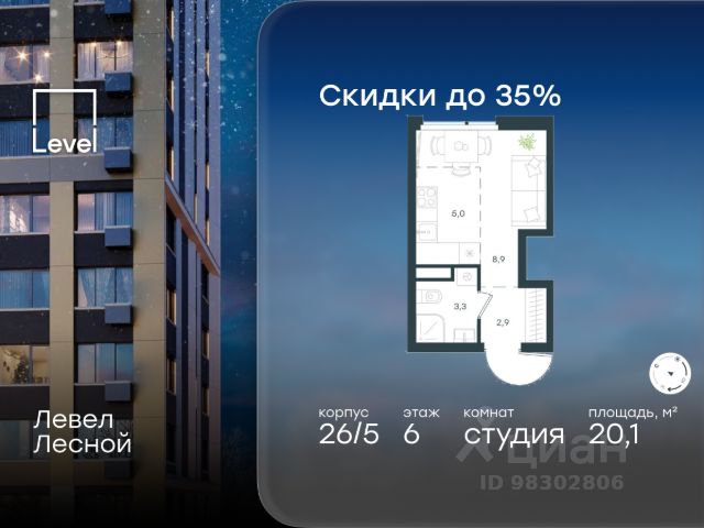 Цена указана с учётом скидки при 100%-й оплате, несубсидированной ипотеке, рассрочке (кроме программы "Рассрочка 0%"). В районе, утопающем в густой зелени лесов, многочисленных парков и скверов, продаётся студия площадью 28.60 кв.м без отделки. Квартира расположена на 15 этаже в жилом комплексе комфорт-класса Левел Лесной (компания Level Group/Левел групп). Отличная транспортная доступность: - 25 мин. пешком до станции метро "Пятницкое шоссе"; - 28 мин. на автобусе до станции метро и МЦД-2 "Волоколамская"; - 11 мин. на авто до МКАД; - 25 мин. на авто до ТТК. Продуманный архитектурный проект: - Концепция проекта Левел Лесной от бюро СПИЧ; - Высотность комплекса до 15 этажей с уникальными видами на лесные массивы и город; - Высота потолков до 3 м; - Современные окна высотой до 1,6 м, в части квартир предусмотрены окна в пол. Высота подоконников 0,6 м; Расположение: Жилой комплекс Левел Лесной строится в зелёной зоне ближайшего Подмосковья, г.о. Красногорск в посёлке Отрадное. Шаговая и автомобильная доступность до метро и больших транспортных артерий города. За 25 минут вы дойдёте до станции метро "Пятницкое шоссе", а за 20 минут на машине сможете доехать до станции метро "Тушинская". Район окружен роскошной зеленью лесов и парковых зон, занимающих территорию свыше 1 000 гектаров. Помимо благоприятной экологии, здесь множество возможностей для активного отдыха и поддержания физической формы. Облагороженная территории с полностью развитой инфраструктурой. На территории проекта находится детский сад и школа "Светлые Горы", которая входит в список лучших частных школ от Forbes Education (по данным на 2023г.). Кроме того, в пешей доступности расположено ещё 8 детских садов, а также запланировано открытие современной муниципальной школы. В непосредственной близости находятся сетевые супермаркеты и локальные магазины, аптеки, клиники, почта, библиотека, салоны красоты, рестораны, спортивные и творческие секции, развивающие детские центры. В 12 минутах пешком расположен торговый парк "Отрада" с продуктовым и строительным гипермаркетами, магазинами, кинотеатром и развлечениями для детей. Внутренняя инфраструктура: Мы знаем, как важно, чтобы магазины и сервисы были всегда рядом. В сданных корпусах жилого комплекса Левел Лесной уже расположена полностью готовая развитая инфраструктура. На первых этажах корпуса 27 предусмотрено ещё 14 коммерческих помещений. Благоустройство: Продуманное пространство и аура приватного европейского городка рождают чувство лёгкости и расслабления у каждого, кто попадает на территорию проекта. Концепцию общественных площадок разработали в партнёрстве два архитектурных бюро: Highlight Architecture и SCAPE. В безопасных дворах без машин каждый обязательно найдёт себе место для вдохновения, отдыха и спорта.