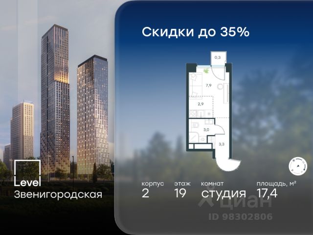10 минут от Москва-Сити В продаже квартира площадью 34.94 м² без отделки на 4 этаже 46 этажного дома. Квартира расположена в корпусе Leo. JOIS это премиальный жилой комплекс от девелопера MR в районе Хорошёво-Мнёвники. Он включает несколько эффектных небоскрёбов высотой 47-56 этажей, эксклюзивные форматы квартир с панорамным остеклением, подземный двухуровневый паркинг на 239 м/м, собственную приватную инфраструктуру, закрытый ландшафтный парк 2,3 Га с функциональным зонированием и охраняемой территорией. Над проектом работали лучшие команды международных агентств с многолетним опытом: Genpro, S&P, iLight International и другие. Расположение Пешком: - 5 мин. ст. МЦК "Хорошёво"; - 15 мин. ст. м. "Народное ополчение"; - 10 мин. ст. метро "Звенигородская" с 2027 года; - 20 мин. причал "Карамышевский". На автомобиле: - 3 мин. до Звенигородского шоссе; - 5 мин. до ТТК: - 8 мин. до Серебряного бора и Строгинского затона - 10 мин. до ММДЦ "Москва-Сити"; - 40 мин. до аэропорта "Шереметьево"; Благоустройство - собственный ландшафтный парк 2,3 Га; - парк скульптур от Cosmoscow; - консьерж-сервис 24/7; - сервисный лифт и вход; - игровые и спортивные площадки; - коворкинг с библиотекой; - лаунж-зона с камином; - игровые комнаты для детей и клуб для подростков с оборудованием для видеоигр; - спортивная студия для индивидуальных тренировок; - гостиная с мини-кухней; - зоны для выгула собак; - подогрев пешеходных дорожек в зимний период; - автополив зелёных насаждений; - премиальные рестораны, кафе, химчистки, аптеки и супермаркеты. Окружение - 4 парка: Покровское-Стрешнево, Филёвский парк, Серебряный бор и Берёзовая роща; - 15 общеобразовательных заведений, в том числе две школы из самых лучших в Москве: государственная школа "Интеграл" и частная "Хорошкола"; - спортивное сооружение "ВЭБ Арена", домашний стадион ФК ЦСКА; - крупнейший в Европе торгово-развлекательный центр "Авиапарк".