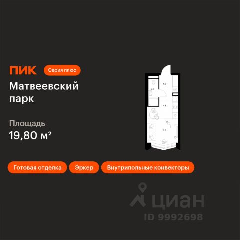Цена указана с учётом скидки при 100%-й оплате, несубсидированной ипотеке, рассрочке (кроме программы "Рассрочка 0%"). В жилом квартале, расположенном на границе с природным заказником "Долина реки Очаковки", продаётся студия площадью 23.90 кв.м без отделки. Квартира расположена на 3 этаже 11-этажного корпуса 12 в жилом комплексе бизнес-класса Левел Мичуринский (компания Level Group/Левел групп). Отличная транспортная доступность: - от 10 мин. пешком до станции метро "Мичуринский проспект" - 15 мин. пешком до станции метро "Аминьевская" - 7 мин. на авто до МКАД - 10 мин. на авто до ТТК - 15 мин. на авто до Москва-Сити Продуманный архитектурный проект: - Выразительная архитектура от известных бюро: корпуса 1-6 - СПИЧ, корпуса 7-13 - Borisov Architects; - Из окон открываются живописные виды на парки, Москва-Сити и МГУ; - Высокие потолки до 6,35 м; - Стильные лобби с окнами в пол и высокими потолками до 4,7 м; - С каждого этажа дома на лифте можно спуститься в подземный отапливаемый паркинг. Расположение: Жилой комплекс Левел Мичуринский строится в одном из самых зелёных районов Москвы - Очаково-Матвеевское. Этот уголок столицы идеален для поддержания здорового образа жизни. В шаговой доступности от проекта находятся заказник "Долина реки Очаковки" - 1 мин. пешком и Очаковский парк - 7 мин. пешком. На велосипеде можно добраться до таких парков, как "Событие", парк Олимпийской деревни, парк 50-летия Октября и парк Школьников. В 15 минутах езды на авто расположено более 30 детских садов (из них 14 в пешей доступности), 32 школы (из них 13 в пешей доступности) и 14 вузов. Также в ближайшем окружении - более 25 медицинских учреждений, 11 спортивных клубов и 22 продуктовых супермаркета. Внутренняя инфраструктура: На территории жилого комплекса строится три детских сада и школа. На первых этажах домов откроется супермаркет, фитнес-центр, ресторан, кафе и другие сервисы. Подземные этажи займут паркинги: трёхуровневые - в этапах 1 и 2, одноуровневый - в этапах 3 и 4. Преимущества проекта: - 4,5 га благоустроенной территории с видовым мостом, уличным кинотеатром, зонами для тихого отдыха, работы, воркаута, площадки для петанка, футбола, настольного тенниса и пляжного волейбола. - Дизайнерские лобби с панорамным видом на двор, мойками для лап животных и комфортными зонами ожидания. - Безопасность жителей: круглосуточное видеонаблюдение всех зон общего пользования (лобби, лифты, паркинги, детские площадки), система контроля доступа, управление видеодомофоном через мобильное приложение, единый ключ доступа на территорию жилого комплекса. - Технологии и комфорт: высокоскоростной Wi-Fi в лобби и на придомовой территории, автоматическая система контроля и учёта ресурсов, абонентская связь с консьержем, распознавание номеров автомобилей при въезде в паркинг и выезде из него.