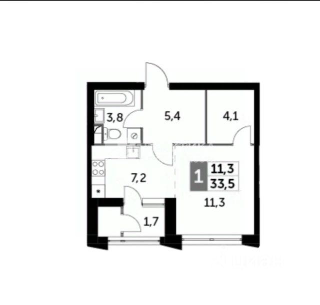 Расположена в корпусе 1 на 10м этаже. Общая площадь — 26,5 м², есть лоджия. Посмотрите фото планировки - отличная квадратная площадь, удобная для зонирования. Перегородка - и вот полноценная однокомнатная квартира.