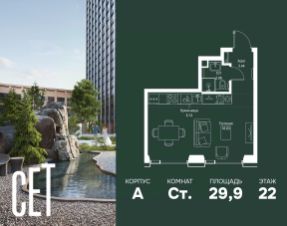 Прямая продажа от застройщика. В ЖК Сет продается студия площадью 23.60 м², расположенная в корпусе 2, на 4 этаже 59 этажного дома. Сет имеет стратегически выгодное расположение в ЗАО, в районе с большой историей и блестящим будущим: между природной зоной долины реки Сетунь и Кутузовским проспектом. В рамках возведения первой очереди предусмотрено три корпуса высотой 18, 45 и 59 этажей. На верхних этажах спроектированы общедоступные смотровые площадки с панорамным обзором на центр столицы. Преимущества проекта: • Функциональные планировочные решения • Контроль проникновения через входную дверь • Система управления освещением и температурой в квартире • Система защиты от протечек с функцией перекрытия воды • Вход в подъезд по биометрическим считывателям Face ID • Скоростные лифты • Двухуровневый подземный охраняемый паркинг на 495 машино-мест Застройка Сет включает в себя не только жилые корпуса, но и инфраструктурные объекты. Все необходимое для повседневного комфорта будет расположено в шаговой доступности: • Фитнес-Клуб с бассейном • Ведущая городская школа, детский сад и школа искусств • Центр культуры и досуга • Медицинский центр • Кафе и рестораны Расположение комплекса: Пешком: • Метро "Давыдково" - 17 минут • Парк "Долина реки Сетунь" - 3 минуты • Открытие новых станций метро в шаговой доступности в будущем Инфраструктура: Разнообразить свой день резиденты Веер смогут также проводя больше времени на свежем воздухе. Двор разделен на 4 зоны разных эмоций и действий, которые пересечены и соединены веерными прогулочными маршрутами: • Спортивная площадка устроена в глубине "Кленовой рощи" • В "Чайном домике" будет создан навес с утеплением для отдыха в любую погоду • Площадки для детей воплотятся в "Волшебный лес" с цветами, зеркалами и световым дизайном • "Центральная площадь" устроена у водного оазиса живописного пруда. На машине: • "Москва-Сити" - 15 минут • Садовое кольцо - 20 минут • ТЦ "Океания" - 8 минут • ТЦ "Времена года" - 13 минут • Сколково - 12 минут • Гребной канал - 17 минут Компания MR предлагает своим клиентам специальные условия приобретения квартир в рамках программ ипотечного кредитования от банков-партнеров. Купить квартиру-студию в ипотеку в новостройке в районе Можайский в Москве.