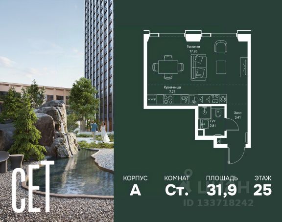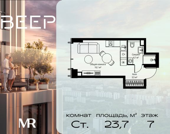 Прямая продажа от застройщика. В ЖК Сет продается студия площадью 23.60 м², расположенная в корпусе 2, на 4 этаже 59 этажного дома. Сет имеет стратегически выгодное расположение в ЗАО, в районе с большой историей и блестящим будущим: между природной зоной долины реки Сетунь и Кутузовским проспектом. В рамках возведения первой очереди предусмотрено три корпуса высотой 18, 45 и 59 этажей. На верхних этажах спроектированы общедоступные смотровые площадки с панорамным обзором на центр столицы. Преимущества проекта: • Функциональные планировочные решения • Контроль проникновения через входную дверь • Система управления освещением и температурой в квартире • Система защиты от протечек с функцией перекрытия воды • Вход в подъезд по биометрическим считывателям Face ID • Скоростные лифты • Двухуровневый подземный охраняемый паркинг на 495 машино-мест Застройка Сет включает в себя не только жилые корпуса, но и инфраструктурные объекты. Все необходимое для повседневного комфорта будет расположено в шаговой доступности: • Фитнес-Клуб с бассейном • Ведущая городская школа, детский сад и школа искусств • Центр культуры и досуга • Медицинский центр • Кафе и рестораны Расположение комплекса: Пешком: • Метро "Давыдково" - 17 минут • Парк "Долина реки Сетунь" - 3 минуты • Открытие новых станций метро в шаговой доступности в будущем Инфраструктура: Разнообразить свой день резиденты Веер смогут также проводя больше времени на свежем воздухе. Двор разделен на 4 зоны разных эмоций и действий, которые пересечены и соединены веерными прогулочными маршрутами: • Спортивная площадка устроена в глубине "Кленовой рощи" • В "Чайном домике" будет создан навес с утеплением для отдыха в любую погоду • Площадки для детей воплотятся в "Волшебный лес" с цветами, зеркалами и световым дизайном • "Центральная площадь" устроена у водного оазиса живописного пруда. На машине: • "Москва-Сити" - 15 минут • Садовое кольцо - 20 минут • ТЦ "Океания" - 8 минут • ТЦ "Времена года" - 13 минут • Сколково - 12 минут • Гребной канал - 17 минут Компания MR предлагает своим клиентам специальные условия приобретения квартир в рамках программ ипотечного кредитования от банков-партнеров.