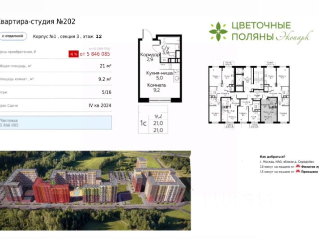 Продается квартира-студия без отделки в 9 фазе города-парка "Первый Московский". Общая площадь квартиры - 27,1 кв. м, этаж 10 из 19. Срок сдачи - 2 квартал 2026 года. Тип дома - монолитный. Цена указана при 100% оплате. Город-парк "Первый Московский" расположен всего в 7 км по Киевскому шоссе (Новая Москва). Из города-парка есть удобный выезд на Киевское шоссе. ТРАНСПОРТНАЯ ДОСТУПНОСТЬ: - 5 мин. на личном автомобиле или 10 мин. на автобусе 189 и 876 до станции метро "Филатов Луг" - 20 мин. пешком до станции метро "Филатов Луг" ИНФРАСТРУКТУРА И БЛАГОУСТРОЙСТВО: 9 фаза сочетает в себе максимальную близость данной фазы строительства к парку Филатов луг. Основной акцент в благоустройстве сделан на разнообразные детские площадки и развивающие комплексы, с зонами для активного и спокойного отдыха взрослых. В доме предусмотрен подвальный этаж для кладовых помещений. В корпусе предусмотрено 2 коммерческих помещения свободного назначения на 1 этаже. АВТОРСКИЙ ДИЗАЙН: Входные группы выполнены по авторскому дизайну, оснащены системой "тёплый пол". В каждой входной группе будет располагаться комфортабельная зона ожидания. При входе предусмотрено помещение для хранения колясок и на -1 этаже располагается велопарковка.