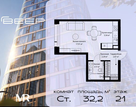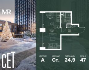 Прямая продажа от застройщика. В ЖК Сет продается студия площадью 27.51 м², расположенная в корпусе А, на 42 этаже 52 этажного дома. Сет имеет стратегически выгодное расположение в ЗАО, в районе с большой историей и блестящим будущим: между природной зоной долины реки Сетунь и Кутузовским проспектом. В рамках возведения первой очереди предусмотрено три корпуса высотой 18, 45 и 59 этажей. На верхних этажах спроектированы общедоступные смотровые площадки с панорамным обзором на центр столицы. Преимущества проекта: • Функциональные планировочные решения • Контроль проникновения через входную дверь • Система управления освещением и температурой в квартире • Система защиты от протечек с функцией перекрытия воды • Вход в подъезд по биометрическим считывателям Face ID • Скоростные лифты • Двухуровневый подземный охраняемый паркинг на 495 машино-мест Застройка Сет включает в себя не только жилые корпуса, но и инфраструктурные объекты. Все необходимое для повседневного комфорта будет расположено в шаговой доступности: • Фитнес-клуб с бассейном • Ведущая городская школа, детский сад и школа искусств • Центр культуры и досуга • Медицинский центр • Кафе и рестораны Расположение комплекса: Пешком: • Метро "Давыдково" - 17 минут • Парк "Долина реки Сетунь" - 3 минуты • Открытие новых станций метро в шаговой доступности в будущем Инфраструктура: Разнообразить свой день резиденты Веер смогут также проводя больше времени на свежем воздухе. Двор разделен на 4 зоны разных эмоций и действий, которые пересечены и соединены веерными прогулочными маршрутами: • Спортивная площадка устроена в глубине ""Кленовой рощи"" • В ""Чайном домике"" будет создан навес с утеплением для отдыха в любую погоду • Площадки для детей воплотятся в ""Волшебный лес"" с цветами, зеркалами и световым дизайном • ""Центральная площадь"" устроена у водного оазиса живописного пруда. На машине: • "Москва-Сити" - 15 минут • Садовое кольцо - 20 минут • ТЦ "Океания" - 8 минут • ТЦ "Времена года" - 13 минут • Сколково - 12 минут • Гребной канал - 17 минут Компания MR предлагает своим клиентам специальные условия приобретения квартир в рамках программ ипотечного кредитования от банков-партнеров. Купить квартиру-студию в новостройке рядом с метро Кунцевская.