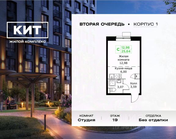 Продаётся студия 25.64 кв.м. без отделки в ЖК "КИТ2" на 19-м этаже 25 этажного дома.Жилой комплекс "Кит 2" спроектирован в урбанистической концепции "Город в Городе". Объект бизнес-класса предлагает рациональный подход к набору опций, необходимых для гармоничной жизни. Проект представляет собой два корпуса, которые образуют единую приватную территорию. Ее доминантой является двор с красивым ландшафтным дизайном и различными зонами, ориентированными на интересы жителей разного возраста. При создании пространства в приоритет ставился комфорт жителей. В шаговой доступности находятся: торговый центр, рестораны, кинотеатры, спортивный зал, образовательные учреждения и множество других объектов в сфере услуг. Преимущества проекта: - 3 корпуса для приватной жизни - Видовые характеристики (просматриваются Москва - Сити и Останкинская телебашня) - Широкая квартирография по всем типам квартир - Увеличенное остекление - 3 варианта отделки: БОРДО, СТОКГОЛЬМ, ОСЛО - Богатая развлекательная инфраструктура - Высокий уровень безопасности территории Расположение комплекса: - 2,2 км до Волковского шоссе - 2,8 км до Ярославского шоссе - 5,7 км до МКАД - 5 минут пешком до ж/д станции "Мытищи" и Автовокзала - 18 минут до станции метро "Комсомольская" - 30 минут до станции метро "Медведково"