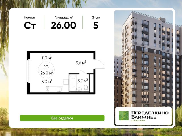 Первая линия домов у пруда! Продается готовая квартира-студия без отделки в городе-парке "Переделкино Ближнее". Общая площадь квартиры - 29,6 кв. м, этаж 1 из 12. Тип дома - монолитный. Город-парк "Переделкино Ближнее" расположен в 8 км от МКАД по Боровскому шоссе. В 7 минутах пешком от проекта расположена станция метро "Рассказовка" Солнцевской линии. В пешей доступности находится ж/д станция "Мичуринец". Добраться до центра Москвы можно за 30 минут. 16 фаза строительства уникальна своим расположением - на берегу пруда в двух шагах от современного парка "Переделкино Ближнее". Все жители 16 фазы смогут комфортно провести время рядом с домом: инфраструктура нового парка включает в себя благоустроенный пляж, площадки детского развития, современный спортивный кластер с пунктом проката инвентаря, велотрассу, памптрек, ресторан на воде, пирс, лодочную станцию. Современный монолитный дом переменной этажности, входные группы домов выполнены по авторскому дизайну. Первые этажи облицованы клинкерным кирпичом. На фасаде предусмотрены корзины для установки кондиционеров. Огороженный двор без машин, в каждом дворе будут установлены уникальные игровые и спортивные площадки, разработанные ведущими мировыми экспертами. На территории проекта есть все необходимые объекты социальной и бытовой инфраструктуры: 7 детских садов, 3 школы, магазины, паркинги, аптеки и др.