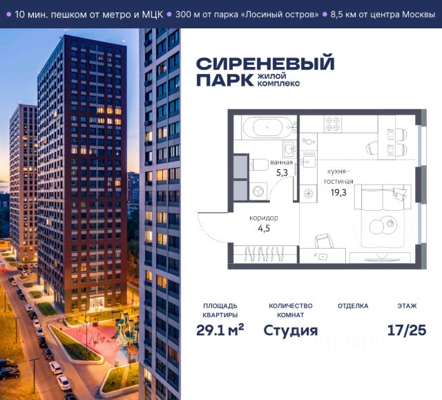 Продаётся просторная студия общей площадью 18.3 м² на 18 этаже в новом жилом комплексе "Сиреневый парк", расположенном в Восточном административном округе Москвы на улице Тагильская. Всего 10 минут ходьбы от станции метро "Бульвар Рокоссовского" и одноимённой платформы МЦК. Высококачественное монолитное строительство гарантирует сохранение тепла в доме, а наличие квартир с предчистовой и чистовой отделкой позволяет вам сэкономить время и сразу же переехать в свое жилье после покупки. Благодаря разнообразию планировок вы сможете выбрать идеальный вариант, соответствующий вашим предпочтениям и образу жизни. Предлагаются квартиры: - с просторными кухнями-гостиными, - с нишами для хранения вещей и отдельными гардеробными, - мастер-спальни с собственными санузлами, - большие комнаты с высокими потолками (2,9 м) и с увеличенными безопасными окнами (1,95 м) , которые наполнят ваш дом естественным светом; - с чистовой отделкой по двум дизайн-проектам на выбор; - с остекленными лоджиями и панорамными видами на лес. Каждая деталь в этом доме создана для вашего комфорта: - безбарьерная среда, - бесшумные скоростные лифты, - машиноместа в отапливаемом подземном паркинге и кладовые на -1 этаже с доступом из лифта, - развитая инфраструктура с супермаркетами, кафе, фитнес-клубами, салонами красоты и частным детским садом обеспечивает максимальное удобство жителям. В 300 метрах от ЖК расположен Национальный парк "Лосиный остров". Способы покупки: 100%, Trade-in, Семейная ипотека без наценки, стандартная ипотека. Запишитесь на просмотр в офис продаж и получите свою персональную скидку по акции Назови свою скидку. ЖК "Сиреневый парк" — гармония в деталях, совершенство в каждом моменте. Застройщик проекта - AFI Development. Продается квартира-студия в новостройке рядом с метро Партизанская.