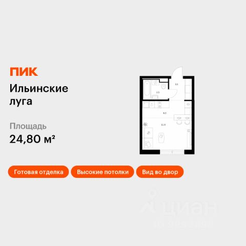 Продаётся квартира-студия площадью 24 кв.м на 8 этаже 9 этажного дома (Корпус 3.5, Секция 5) проекта ПИК Ильинские луга. Светлый просторный подъезд на уровне земли, функциональная планировка, большие окна, c отделкой. Жилой район "Ильинские луга" находится в 10 километрах от МКАД по Новорижскому шоссе, в 20 минутах на автомобиле от станций метро "Волоколамская", "Тушинская" и "Строгино". В будущем ближе к проекту, в 9 минутах пути на машине, откроется станция "Ильинская" Рублёво-Архангельской линии, которая будет соединять Арбатско-Покровскую линию и Большую кольцевую линию. Сейчас в квартале начались продажи в корпусах 3.2, 3.3, 3.4, 3.5 и 3.6. "Ильинские луга" — масштабный проект, в который входит девять детских садов, четыре школы и поликлиника. Он строится в престижном и экологичном районе среди лесов и памятников природы. За 5 минут от жилого квартала можно доехать до Рублёво-Успенского шоссе, а за 30 минут — до центра Москвы. До крупного торгового центра "РИГАМОЛЛ" всего 5 минут на автомобиле, а до ТЦ "Твой дом" и гипермаркета "Глобус" — 10 минут. В "Ильинских лугах" строятся только девятиэтажные дома — такая архитектура соответствует спокойной жизни за городом. В каждом дворе-парке есть места для отдыха, детские и спортивные площадки. А ещё, здесь уже открыт большой PlayHub "Гравити" — современное игровое пространство с космической тематикой, холмами, зонами для игр и отдыха жителей любого возраста. На первых этажах уже работают магазины, кафе и пекарни. Места для отдыха от "Ильинских лугов" тоже недалеко: 10 минут на машине — и вы в музее-усадьбе "Архангельское". Также рядом находится Лохин остров — памятник природы, где водятся речные черепахи, есть места для кемпинга и возможность сплавиться по реке. Артикул 1002012 (Застройщик ООО "СЗ "ГРАДОЛИМП")
