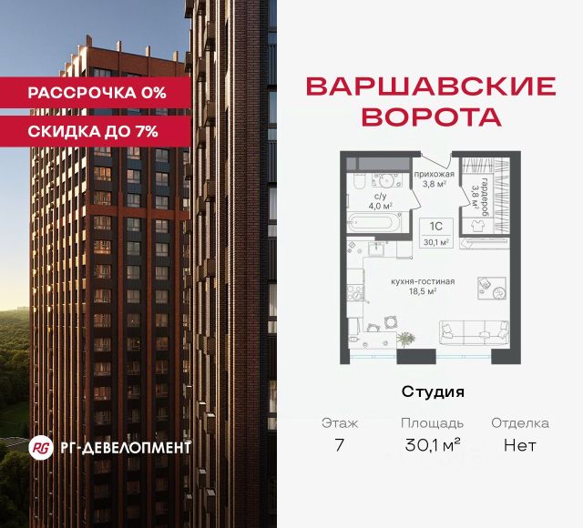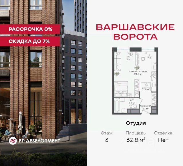 Рассрочка 0% + скидка 5%. Первый платёж 50% при ДДУ, второй 50% — через 12 мес. до ввода ЖК. Продаются Апартаменты-студия 24,6 кв.м. в МФК "Варшавские ворота" на 9-м этаже 9 этажного дома. МФК "Варшавские ворота" — это проект, в котором учтен широкий спектр требований: от транспортной доступности и развитой инфраструктуры до архитектурной выразительности и экологического окружения. Апартаменты в МФК "Варшавские ворота" подойдут для тех, кто ищет продуманное жилье в Москве или готовый инвестиционный актив. Апартаменты здесь — это: - возможность жить комфортно в удобном городском формате — с природой, метро, сервисом и паркингом; - возможность купить лот с готовой отделкой, чтобы вложить минимальные инвестиции в ремонт и получить максимум возможностей от сдачи; - экономия на налоге на имущество, кадастровая стоимость апартаментов ниже ~ на 30% кадастровой стоимости квартиры; - высокая инвестиционная доходность объекта за счет более низкой цены покупки по сравнению с квартирой. Коротко о важном: - 1 минута пешком от м. Аннино; - Удобные выезды на Варшавское шоссе и МКАД; - Вид из окон на Битцевский лес и Аннинский лесопарк; - Высота потолков 2,7 - 3 м; - Закрытый двор-парк; - Школы и детские сады в 10-15 минутах пешком от дома; - Технические лоджии для размещения кондиционеров; - Подземный паркинг; - РГ-Девелопмент — ТОП-20 крупнейших застройщиков России. Проект сочетает в себе современную архитектуру и продуманное благоустройство с уникальным природным окружением. Всего в нескольких минутах от дома — девять парков, каскад прудов и крупнейшие лесопарковые зоны Москвы, создающие ощущение жизни в зеленом оазисе посреди мегаполиса. Архитектурная концепция - стиль Чикаго в Москве. Выполнена в минималистичной эстетике с использованием клинкера и декоративного кирпича. Фасады подчеркивают строгие линии и современный стиль, а входные группы разработаны московским бюро Syntaxis. Лобби оформлены с применением керамогранита, декоративной штукатурки и гипсовых панелей, детали из латуни добавляют изысканности. Пространство оживляют гербарии, композиции из сухоцветов и авторские панно. Проект находится в одной минуте пешком от метро "Аннино", в 12 минутах от станции "Улица Академика Янгеля" и рядом с МЦД-2 "Красный Строитель". Для автомобилистов предусмотрен прямой выезд на Варшавское шоссе и два съезда на МКАД, что позволяет быстро добираться в любую часть города. Среди планировочных решений представлены разнообразные форматы: от функциональных студий до просторных 4-комнатных квартир и апартаментов площадью от 22 до 105 м². Высокие потолки усиливают ощущение простора, а продуманные планировки включают мастер-спальни, гардеробные, угловые окна, объединённые кухни-гостиные и несколько санузлов. Центральное пространство комплекса — закрытый двор без машин. Он разделён на функциональные зоны: детские игровые комплексы, спортивные площадки, воркаут-зоны и уютные места для тихого отдыха. На первых этажах разместятся м Купить квартиру-студию в новостройке рядом с метро Улица Академика Янгеля.