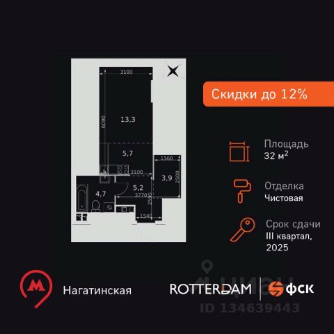 Старт продаж второй очереди ЖК Первый Нагатинский! Продаётся квартира-студия площадью 37,8 м², расположенная на 38 этаже корпуса 2,1. Панорамные виды на город, современные планировочные решения и выгодные условия покупки. Прямая продажа от застройщика — лучшие цены на старте! В ноябре 2025 года совместно со Сбер действует ипотечная программа на эту квартиру с фиксированной ставкой 13,9% на весь срок кредитования. Также доступна программа рассрочки до конца 2028 года с фиксированными платежами от 60 000 рублей. Подробности у менеджеров отдела продаж в онлайн-чате справа. Первый Нагатинский — самый масштабный жилой квартал, формирующий новый облик района и задающий стандарты жизни бизнес-класса. Транспортная доступность. Находится в сердце Южного округа Москвы — районе с уже сложившейся и богатой инфраструктурой. Внешняя среда проекта усиливает комфорт жизни: рядом расположены зелёные парки, современные спортивные объекты, торговые центры и престижные образовательные учреждения. м. Нагатинская ~ 3 мин. МЦК Верхние котлы ~ 5 мин. Речной причал ~ 15 мин. ТТК ~ 10 мин. Садовое кольцо ~ 15 мин. Благоустройство премиального уровня. Ландшафтные архитекторы бюро А4 продумали благоустройство квартала как систему взаимосвязанных пространств для отдыха и вдохновения. Уникальное wellness-пространство гармонично вписано в городской ландшафт и создает атмосферу уверенности и спокойствия. 10 000 зеленых насаждений Японский сад Зона у огня с биокамином Зона у воды Арт-тропа Променад Воркаут-площадка Зона релаксации в гамаках Нетворкинг под открытым небом Инфраструктура нового поколения. Приватные клубные пространства, пляжный клуб на берегу Москвы-реки, детские зоны нового поколения и творческие студии формируют единый ритм жизни, где комфорт и возможности не имеют границ. Эстетика каждого элемента и продуманная логистика превращают повседневность в удовольствие, а привычные будни — в лучшие сценарии жизни. Скай-бар на 28 этаже Гурме вилла Приватный СПА и фитнес премиум-класса Тренажёрный зал, зал для групповых занятий Хамам и финская сауна Коворкинг-клуб Клубный лаундж Клубный кинотеатр Сигарная комната Музыкальная студия Арт-зал с подиумом Игровая зона и настольные игры для детей Класс для обучения и мастер-классов Детские площадки круглый год Пляжный клуб для резидентов Образовательный кластер внутри квартала. Внутри квартала созданы пространства для образования, творчества и игр, где дети могут развиваться, раскрывать таланты и чувствовать себя в безопасности — не покидая территории своего дома. Школа нового поколения на 1000 учеников Лучший детский сад в Москве с бассейном Тематическая детская площадка Гора Фудзияма и Большая волна Архитектура. Архитектура жилого квартала отражает современный комфорт и безупречный стиль. Каждая деталь фасадов продумана с вниманием к эстетике и качеству. Навесная 3D-фасадная система придаёт зданиям выразительность, ускоряет монтаж и обеспечивает долговечность конструкции. Проект создан ведущими архитектурными