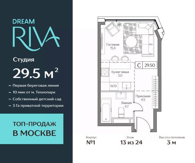 Увеличенный объем панорамного остекления создает неповторимое ощущения воздушности пространства! Двор-набережная с видами на гладь реки и кроны деревьев. Премиальный квартал DREAM RIVA — авторская архитектура в курортной концепции, воплощающей силу природных стихий в каждой детали оформления и благоустройства. Продаётся Студия на 5 этаже 26-этажного дома (3 корпус). Общая площадь: 29.5 кв.м. Высота потолков от 3 м. Формат приватного досуга и эксклюзивные привилегии в DREAM RIVA с приоритетным доступом для резидентов: - Первая линия Москвы-реки с открытыми видами на воду и город; - 3 Га приватного прибрежного парка с зонами для спорта и йоги; - Открытый солярий; - Школа и собственный детский сад; - Многофункциональные детские игровые площадки и детское кафе с игровой комнатой; - Клубная гостиная и lounge-бар. Локация вне конкуренции — инфраструктура полуострова предлагает всё, что нужно для размеренной жизни, работы, отдыха и развлечений: - Благоустроенная набережная с гастрогалереей; - Парк аттракционов Остров Мечты (в торговой части: рестораны, кафе, супермаркет, магазины, салон красоты, йога-студия и многое другое); - 44 Га ландшафтных парков для прогулок, спорта, пикников; - Пляжный комплекс Dream Beach Club со множеством бассейнов, ресторанов, баров и развлечений для любого возраста; - Яхт-клуб; - Вейк-парк; - Кинотеатр под открытым небом и многое другое. Удобная транспортная доступность: - Центр рядом: 15 минут до Садового кольца на авто, 20 минут до Сити или Кремля; - В 5 минутах прогулочным шагом — станция метро "Технопарк"; - Южный речной вокзал. Наши менеджеры будут рады провести для Вас консультацию и подробнее рассказать о проекте. Успейте купить на лучших условиях!