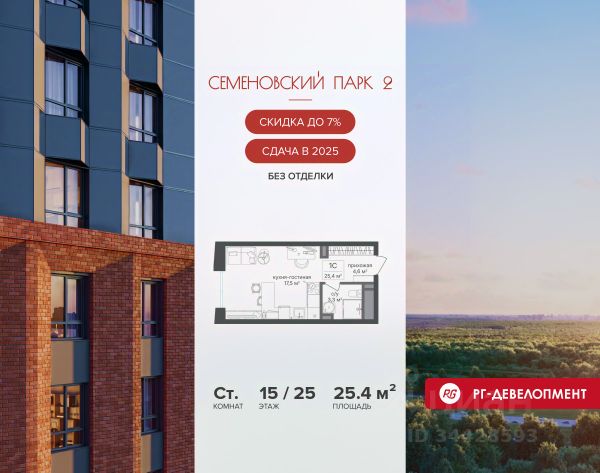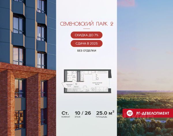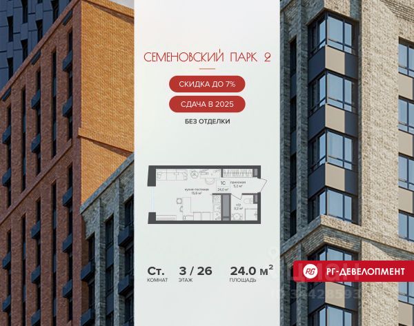 Ипотека для каждого! Полная стоимость кредита от 11,578% до 22,490%. Ставка от 0,11% в АО "Альфа-Банк" фиксируется на 1 год с даты заключения кредитного договора, далее полная стоимость кредита от 25,819% до 28,767% ставка 21,59% до окончания срока кредитования. Первоначальный взнос — от 20% от стоимости квартиры. Срок кредитования — от 3 до 30 лет. Ипотека на весь срок! Полная стоимость кредита от 23,396% до 26,058% со ставкой 14,5%! Первоначальный взнос —от 20,01% от стоимости квартиры. Срок кредитования — от 3 до 30 лет. АО "Банк ДОМ.РФ" универсальная лицензия Банка России 2312 от 19.12.2018. Скидка 7% при покупке квартиры! Цена указана с учетом максимального размера скидки. Продается студия 25,0 кв.м. в ЖК "Семеновский парк 2" на 10-м этаже 26 этажного дома. Компания "РГ-Девелопмент" предоставляет скидки на квартиры в жилом комплексе. Акция действительна с 12.09.24 г. до 30.11.25г. включительно. Чтобы воспользоваться предложением, необходимо подписать договор на приобретение недвижимости до 30.11.25г., включительно. Прямая продажа от застройщика! Квартиры без отделки. Срок сдачи корпуса - 4 кв. 2025 г. ЖК "Семеновский парк 2" - это идеальное место для того, чтобы стать вашим домом. Проект расположен в исторической части Москвы вблизи Измайловского лесопарка, в 1 км от ЦАО. 4 станции метро отделяют вас от Красной площади и 15 минут на автомобиле - от Садового кольца. Купить квартиру-студию в новостройке в районе Соколиная гора в Москве.
