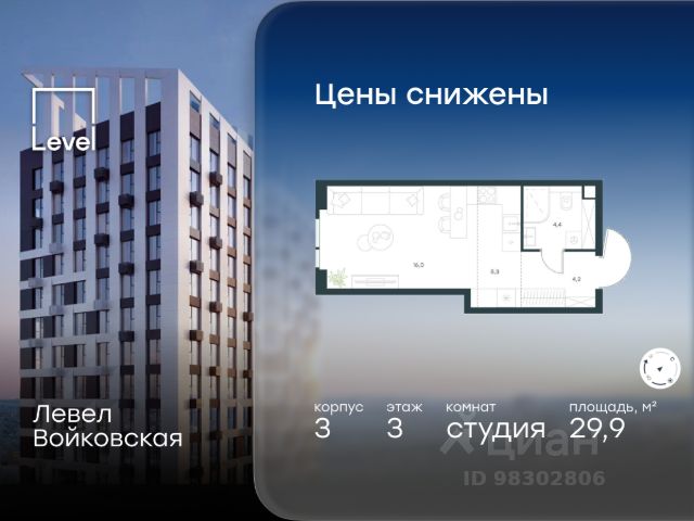 Цена указана с учётом скидки при 100%-й оплате, несубсидированной ипотеке, рассрочке (кроме программы "Рассрочка 0%"). Продается студия площадью 29.10 кв. м без отделки. Квартира находится на 20 этаже 20-этажного корпуса 5, в новом жилом комплексе бизнес-класса Левел Войковская, расположенном рядом с живописным заповедником "Покровское-Стрешнево" (застройщик - компания Level Group/Левел групп). Прекрасная транспортная доступность - 7 мин. пешком до станции МЦК "Балтийская"; - 15 мин. пешком до станции метро "Войковская"; - 8 мин. на машине до ТТК; - 15 мин. на машине до центра Москвы; - 20 мин. на машине до Москва-Сити. Продуманный архитектурный проект - стильная архитектура от мастерской Фефелова В. В.; - панорамные виды на парки, Химкинское водохранилище и Останкинскую башню; - лобби с высотой потолков до 6,45 метров; - более 20 видов планировок, включая редкие форматы квартир с террасой и увеличенной высотой потолков до 5,42 метров; - 2 варианта дизайнерской отделки в корпусе 4 как дополнительная опция к предчистовой отделке: стиль Модерн в светлых холодных тонах и стиль Классик в нейтральной бежевой гамме. Квартиры в корпусах 3 и 5 сдаются без отделки. Расположение Жилой комплекс Левел Войковская строится в престижном Северном округе Москвы, где развитая инфраструктура и живописная природа переплетаются в единый ансамбль. Войковский район окружают парки и набережные. В шаговой доступности - парк "Покровское-Стрешнево", не более 15-ти минут на велосипеде занимает путь до Тимирязевского парка и 9-ти минут до парка усадьбы Михалково. Рядом более 60 школ, 75 дошкольных учреждений, 17 государственных и 6 частных вузов, 25 супермаркетов, 4 торговых центра, среди которых ТЦ "Метрополис" и ТЦ "Авиапарк". Внутренняя инфраструктура На территории жилого комплекса предусмотрены коммерческие помещения: кафе, ресторан, пекарня и другие сервисы на первых этажах корпусов. Для жителей будет доступен отапливаемый подземный паркинг на 244 машино-места с доступом с любого этажа на лифте. На территории паркинга будет расположено 125 кладовых помещений для хранения сезонного инвентаря. Лобби и благоустройство Дизайн лобби жилого комплекса Левел Войковская создан совместно с бюро "Бланк Архитектс" (Blank Architects). Теплая цветовая гамма, ресепшен, зоны ожидания, лапомойки и гостевые санузлы - каждая деталь превращает лобби в комфортное продолжение вашего дома. 1,15 га площади в первых двух этапах строительства отведено под приватный внутренний двор, который спроектирован совместно с бюро "Правда". Детские площадки для всех возрастов, спортивные пространства для йоги, уличных тренировок и петанка, уютные зоны для тихого отдыха или работы. Здесь утро начинается с вдохновения, а вечер наполнен приятными моментами. Лифты Комфортное перемещение внутри жилого комплекса обеспечат надёжные лифты с доступом в паркинг с жилых этажей. В каждом корпусе предусмотрено по 3 грузопассажирских лифта.