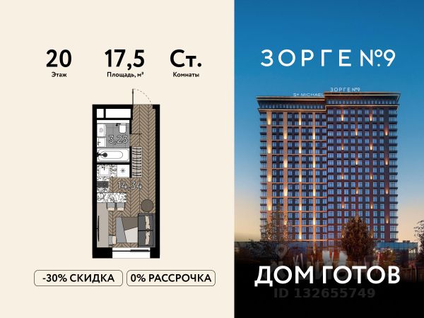 "Зорге 9" — готовые апартаменты бизнес-класса на Ходынке. 10 минут до Москва-Сити. Архитектура: 3 современных корпуса с фасадами в стиле архитектуры Нью-Йорка и с сервисами премиальных отелей, высотой до 23 этажа. Строгие линии, панорамные окна создают ощущение неподдельной роскоши и комфортной жизни в сердце мегаполиса. Проект награжден авторитетной премией European Property Awards. Резиденции: Свободная планировка, небольшая глубина этажа, огромные панорамные окна в пол до 3,6 м и высота потолков до от 3,3 до 4,3 м позволяют реализовать самые смелые концептуальные идеи и создать идеальный интерьер с учетом всех пожеланий. Вдохновляющие виды на город украсят ваш апартамент лучше любой картины. Есть возможность приобретения дизайн-проекта и полной меблировки апартаментов от партнеров девелопера. Расположение: 3 мин. пешком до парка Березовая роща 10 мин. пешком до Ходынского поля 10 мин. до ТЦ Авиапарк 30 минут до Шереметьево 10 мин до Москва-Сити или 1 станция до Москва-Сити 5 минут до ТТК 4 станции метро в шаговой доступности: 6 мин м. Полежаевская (фиолетовая ветка) 7 мин МЦК Зорге (МЦК) 7 мин м. Хорошевская (голубая ветка) 10 мин МЦК Хорошёво (МЦК) Благоустройство: Собственный парк 2 га с амфитеатром и поющими фонтанами. В парке высажено 136 деревьев и более 11 000 кустов и мелких растений из немецких питомников. Площадка для йоги и воркаут-зона со спортивными площадками. Теннисные столы и детский плейхаб Две башни Авторское гранд-лобби В лобби предусмотрена лаундж-зона, чайная с камином, комната для хранения велосипедов и колясок. Доступ по системе FACE ID. В отделке лобби и лифтовых холлов использован декоративный камень итальянского бренда Atlas Concorde Пентхаусы На верхнем уровне комплекса расположены роскошные просторные пентхаусы с высотой потолка до 4,2 метра и панорамными окнами до 3,6 метров, открывающими великолепные виды на столицу. Пентхаусы с выходами на собственные приватные террасы на кровле, площадью от 150 кв. м являются жильем high-уровня, демонстрирующим высокий статус владельца.