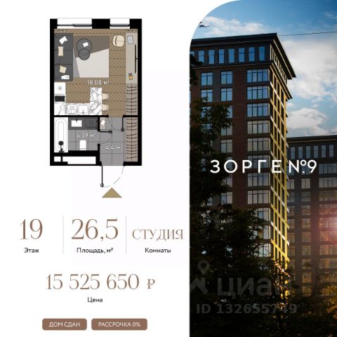 "Зорге 9" — готовый квартал апартаментов с премиальными сервисами на Ходынке. В трех корпусах с панорамными окнами предусмотрены уникальные форматы площадей, удовлетворяющие самый взыскательный вкус. В 7 минутах ходьбы от "Зорге 9" расположены 4 станции метро: Полежаевская", "Хорошевская", "Зорге" и "Хорошево". До делового центра "Москва-Сити" 10 минут на автомобиле. Простота форм, строгие линии, панорамные окна, архитектурное освещение и арт-объекты поддержат атмосферу роскоши и комфортной жизни на Ходынке. Именно за яркую архитектуру апарт-комплекс "Зорге 9" получил престижную международную премию European Property Awards. Комплекс полностью введен в эксплуатацию. "Зорге 9" — территория инноваций. Высокие потолки и панорамные окна Guardian ClimaGuard Solar с энергоэффективным "умным" напылением. Предусмотрен ряд премиальных сервисов: вход по Face ID, мобильное приложение резидента, дающее доступ ко всем услугам в один клик, 500 видеокамер на территории, двухуровневый подземный паркинг с автоматическим шлагбаумом, зарядкой для электромобилей, велосейфом и станцией подкачки шин. В "Зорге 9" можно рассмотреть варианты площадей от 27 до 81 кв. м, свободной планировки, с окнами в пол и высотой потолков до 4,3 м, а также уникальные форматы пространств. Апартаменты с террасами позволят создать дополнительное рабочее пространство или зону отдыха на свежем воздухе, а тканевые маркизы помогут создать тень и повысить уровень приватности. Угловое остекление станет особой изюминкой и украсит любой интерьер. На последних этажах предусмотрены пентхаусы с каминами и выходами на кровлю: от 150 кв. м жилья high-уровня с максимальным уровнем инсоляции — на потолках в пентхаусах появятся так называемые "световые фонари". "Зорге 9" СДАН, все корпуса введены в эксплуатацию. Продается квартира-студия в новостройке станция Зорге (МЦК).