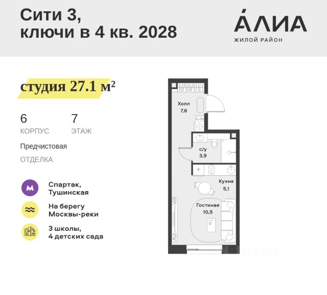 Продаётся Студия 27.1 м². В жилом районе Алиа на 7-м этаже 28-этажного дома. Жилой район Алиа — это дома бизнес-класса у слияния Москвы-реки и Сходни. Алиа находится в Покровском-Стрешневе, экологически чистом районе на престижном северо-западе столицы. Район возводится на бывшей территории Тушинского аэрополя, где никогда не было промышленного производства. Алиа — это район разностороннего развития, спроектированный по принципу WORK.LIVE.PLAY.LEARN. Это "15-минутный город", где вся необходимая для комфортной жизни инфраструктура — на расстоянии приятной прогулки. У района удобное расположение: отсюда меньше 10 минут пешком до станций метро "Спартак" и "Тушинская" и всего полчаса на автомобиле до центра города или аэропорта Шереметьево. Архитектурную концепцию Алиа разработало бюро SOM (Skidmore, Owings & Merrill), авторы знаменитой "Бурдж-Халифа". В Алиа больше 140 планировочных решений, среди которых — редкие для Москвы форматы: квартиры с окном в ванной, пентхаус, сити-юниты и таунхаусы. Почти половина территории района отдана под благоустройство. В Алиа три парка: Линейный парк с кафе и магазинами, Центральный парк с амфитеатром, сухим фонтаном и большим плейхабом для детей всех возрастов и Прибрежный парк на собственной набережной, одной из самых длинных в Москве. В каждом урбан-блоке — закрытый внутренний двор с гипоаллергенными растениями и детской площадкой. В лобби каждого жилого корпуса в Алиа оборудована зона ожидания, колясочная, гостевой санузел и лапомойка для домашних животных. За стойкой ресепшена резидентов и их гостей встречает консьерж. Центральное лобби урбан-блока — это стильное общественное пространство с коворкингом, лаундж-зоной и кофе-пойнтом. Это "вторая гостиная" жителей урбан-блока и одно из мест, где формируется комьюнити Алиа. Два ключевых объекта инфраструктуры в Алиа — это спорткомплекс "Чкалов Арена", где представлены 25 видов спорта, и самый большой в стране бизнес-парк класса A, благодаря которому району обеспечено быстрое развитие. Продается квартира-студия в новостройке в округе СЗАО в Москве.