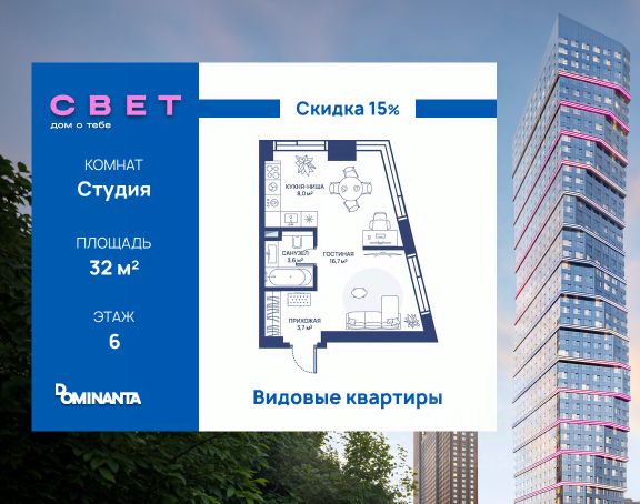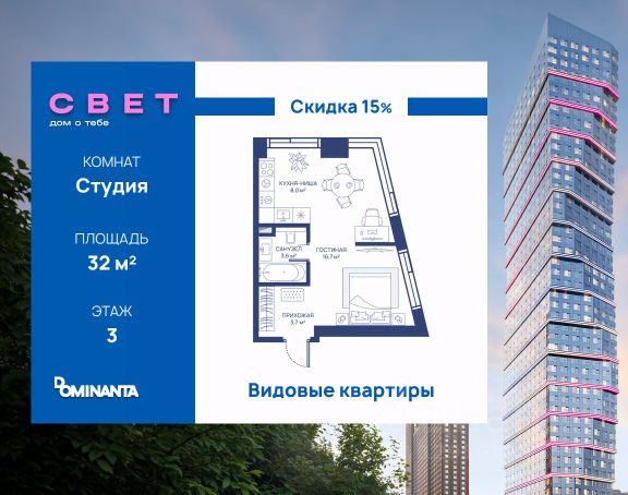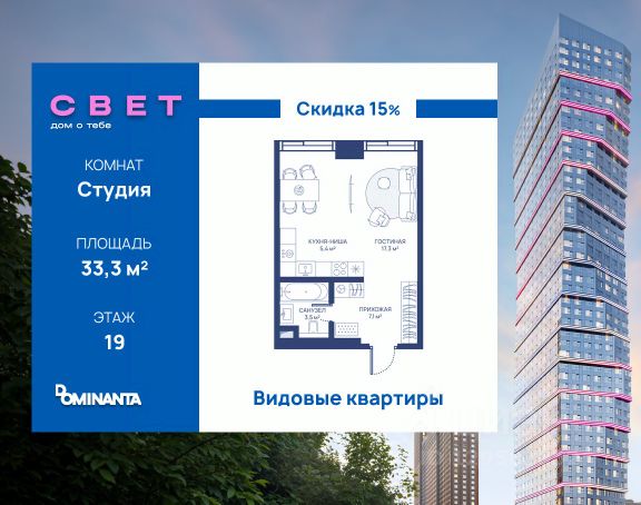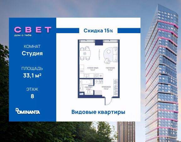 Продаётся студия 33.1 кв.м. на 8-м этаже 51 этажного дома. Без отделки. Срок сдачи: 1 кв. 2028 г. Жилой комплекс "СВЕТ" — воплощение современного комфорта и архитектурного изящества, созданное девелопером Dominanta в сотрудничестве с известным бюро СПИЧ. Комплекс представляет собой элегантное 52-этажное здание, расположенное в Западном Дегунино, на Дмитровском шоссе, 83А. Удачное местоположение обеспечивает удобство для жителей: станция метро "Селигерская" находится в пешей доступности, что делает путь в центр Москвы быстрым и комфортным. Транспортная доступность: - 5 минут пешком до станции метро "Селигерская" - 15 минут на машине до ТТК - 16 минут на транспорте до станции МЦД "Моссельмаш" Квартиры бизнес-класса в ЖК "СВЕТ" сочетают функциональность и эстетическое совершенство. Панорамные окна наполняют жилые пространства естественным светом и открывают захватывающие виды на мегаполис. Каждый житель дома получит доступ к бесплатной клубной инфраструктер SocialHUB. Для бизнес-задач и запуска личных проектов хоум-офис c рабочими станциями, переговорными и креативной студией. Для отдыха и формирования новых социальных связей ивент-пространство, которое подойдет для вечеринки, кинопоказа или паблик-тока. Для новых побед зоны для занятия киберспортом. И главное SocialHUB полностью бесплатен для жителей, все расходы на его содержание покрываются застройщиком. Территория проекта "СВЕТ" включает несколько сценарных зон: ландшафтный парк с шаговой тропой, спортивная зона, открытый амфитеатр, двухуровневая детская площадка, уличные рабочие станции и беседки для отдыха. Сложный рельеф с искусственными холмами и живыми изгородям позволяет эффективно разделить пространство на активные зоны и уединённые "кабинеты" для работы, отдыха или медитации. В ЖК "СВЕТ" каждый найдет арену для своей энергии. Для любителей динамичных игр — павильон для падел (модного микса тенниса и сквоша). Рядом — площадка для стритбола и столы для пинг-понга, где можно устроить соседский турнир! И, конечно, абсолютный мастхэв — зона воркаут для функциональных тренировок под открытым небом. У входа в жилой комплекс гостей встречается арт-объект, разработанный Студией Артемия Лебедева. Его мягкий, волнообразный силуэт напоминает разлитый свет. С заходом солнца арт-объект оживает благодаря светоотражающим материалам его форма становится динамичной и задает настроение всему пространству. Продам квартиру-студию в новостройке в районе Западное Дегунино в Москве.
