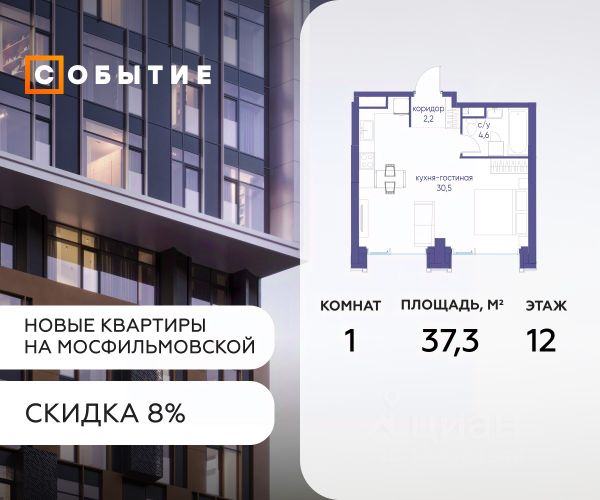 Цена указана с учётом скидки при 100%-й оплате, несубсидированной ипотеке, рассрочке (кроме программы "Рассрочка 0%"). В жилом квартале, расположенном на границе с природным заказником "Долина реки Очаковки", продаётся студия площадью 22.20 кв.м без отделки. Квартира расположена на 22 этаже 42-этажного корпуса 2 в жилом комплексе бизнес-класса Левел Мичуринский (компания Level Group/Левел групп). Отличная транспортная доступность: - от 10 мин. пешком до станции метро "Мичуринский проспект" - 15 мин. пешком до станции метро "Аминьевская" - 7 мин. на авто до МКАД - 10 мин. на авто до ТТК - 15 мин. на авто до Москва-Сити Продуманный архитектурный проект: - Выразительная архитектура от известных бюро: корпуса 1-6 - СПИЧ, корпуса 7-13 - Borisov Architects; - Из окон открываются живописные виды на парки, Москва-Сити и МГУ; - Высокие потолки до 6,35 м; - Стильные лобби с окнами в пол и высокими потолками до 4,7 м; - С каждого этажа дома на лифте можно спуститься в подземный отапливаемый паркинг. Расположение: Жилой комплекс Левел Мичуринский строится в одном из самых зелёных районов Москвы - Очаково-Матвеевское. Этот уголок столицы идеален для поддержания здорового образа жизни. В шаговой доступности от проекта находятся заказник "Долина реки Очаковки" - 1 мин. пешком и Очаковский парк - 7 мин. пешком. На велосипеде можно добраться до таких парков, как "Событие", парк Олимпийской деревни, парк 50-летия Октября и парк Школьников. В 15 минутах езды на авто расположено более 30 детских садов (из них 14 в пешей доступности), 32 школы (из них 13 в пешей доступности) и 14 вузов. Также в ближайшем окружении - более 25 медицинских учреждений, 11 спортивных клубов и 22 продуктовых супермаркета. Внутренняя инфраструктура: На территории жилого комплекса строится три детских сада и школа. На первых этажах домов откроется супермаркет, фитнес-центр, ресторан, кафе и другие сервисы. Подземные этажи займут паркинги: трёхуровневые - в этапах 1 и 2, одноуровневый - в этапах 3 и 4. Преимущества проекта: - 4,5 га благоустроенной территории с видовым мостом, уличным кинотеатром, зонами для тихого отдыха, работы, воркаута, площадки для петанка, футбола, настольного тенниса и пляжного волейбола. - Дизайнерские лобби с панорамным видом на двор, мойками для лап животных и комфортными зонами ожидания. - Безопасность жителей: круглосуточное видеонаблюдение всех зон общего пользования (лобби, лифты, паркинги, детские площадки), система контроля доступа, управление видеодомофоном через мобильное приложение, единый ключ доступа на территорию жилого комплекса. - Технологии и комфорт: высокоскоростной Wi-Fi в лобби и на придомовой территории, автоматическая система контроля и учёта ресурсов, абонентская связь с консьержем, распознавание номеров автомобилей при въезде в паркинг и выезде из него.