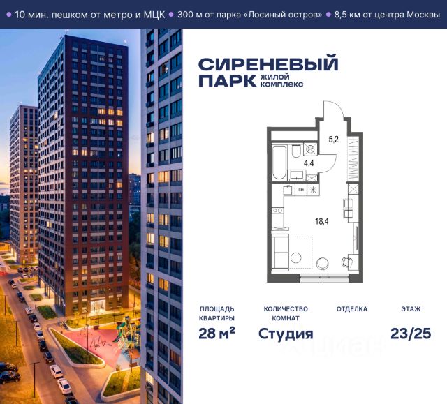 Продаётся просторная студия общей площадью 23.8 м² на 25 этаже в новом жилом комплексе "Сиреневый парк", расположенном в Восточном административном округе Москвы на улице Тагильская. Всего 10 минут ходьбы от станции метро "Бульвар Рокоссовского" и одноимённой платформы МЦК. Высококачественное монолитное строительство гарантирует сохранение тепла в доме, а наличие квартир с предчистовой и чистовой отделкой позволяет вам сэкономить время и сразу же переехать в свое жилье после покупки. Благодаря разнообразию планировок вы сможете выбрать идеальный вариант, соответствующий вашим предпочтениям и образу жизни. Предлагаются квартиры: - с просторными кухнями-гостиными, - с нишами для хранения вещей и отдельными гардеробными, - мастер-спальни с собственными санузлами, - большие комнаты с высокими потолками (2,9 м) и с увеличенными безопасными окнами (1,95 м) , которые наполнят ваш дом естественным светом; - с чистовой отделкой по двум дизайн-проектам на выбор; - с остекленными лоджиями и панорамными видами на лес. Каждая деталь в этом доме создана для вашего комфорта: - безбарьерная среда, - бесшумные скоростные лифты, - машиноместа в отапливаемом подземном паркинге и кладовые на -1 этаже с доступом из лифта, - развитая инфраструктура с супермаркетами, кафе, фитнес-клубами, салонами красоты и частным детским садом обеспечивает максимальное удобство жителям. В 300 метрах от ЖК расположен Национальный парк "Лосиный остров". Способы покупки: 100%, Trade-in, Семейная ипотека без наценки, стандартная ипотека. Запишитесь на просмотр в офис продаж и получите свою персональную скидку по акции Назови свою скидку. ЖК "Сиреневый парк" — гармония в деталях, совершенство в каждом моменте. Застройщик проекта - AFI Development. Продам квартиру-студию с отделкой от застройщика рядом с метро Партизанская.