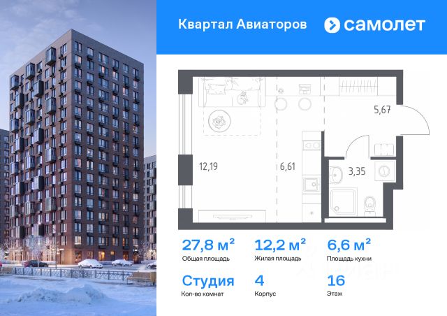 Строим кварталы для жизни с заботой о будущем. Предлагается квартира студия комфорт-класса 27,82 кв.м в корпусе 4 на 16 этаже, в ЖК "Квартал Авиаторов" Квартира без отделки. Доступность опции "отделка" и возможность комплектации мебелью и декором уточняйте у застройщика. Приобрести квартиру возможно по специальным акциям от застройщика, с текущими условиями акций можно ознакомиться в блоке "Акций". Цена динамическая и может отличаться, уточняйте актуальность у застройщика. "Квартал Авиаторов" — жилой комплекс комфорт-класса, расположенный в 2 км от железнодорожной станции Балашиха (5 минут на автомобиле, 30 минут пешком). Поблизости — Горенский лесопарк и заповедник "Лосиный остров". В проекте предусмотрены закрытые дворы с детскими и спортивными площадками, безбарьерная среда.