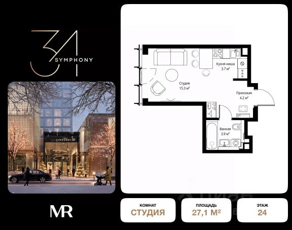 Дом сдан. Ключи в день покупки! В продаже студия площадью 27.10 м² с чистовой отделкой на 24 этаже 36 этажного дома в корпусе Сиена. ЖК Симфония 34 - концептуально новый жилой комплекс премиум-класса с подземной парковкой, состоит из четырех башен высотой 36 - 54 этажа. Квартиры сдаются с дизайнерской чистовой отделкой MR READY с встроенными кухнями и премиальной техникой. Приобретение квартиры с чистовой отделкой позволяет избежать лишних хлопот, ведь включает в себя установку мебели и бытовой техники на кухне, что является дополнительным бонусом. Высота потолков 3 - 6 метров, окна высотой до 2,6 м. Более 100 кладовых в подземной части ЖК и более 500 на этажах. Безопасность - Система контроля входа на территорию комплекса, биометрия - Система автоматического водяного пожаротушения и противопожарного водопровода, система пожарной вентиляции - Доступ на парковку при помощи системы распознавания автомобильных номеров, карточка для контроля доступа резидентов - Система видеонаблюдения - Круглосуточная связь через приложение, телефон, голосовые сообщения с охраной, консьержем, call-центр Расположение Пешком - 6 минут до метро "Дмитровская" - 15 минут до Тимирязевского парка На машине - 5 минут до Савеловского вокзала и Аэроэкспресса в Шереметьево - 10 минут до Москва-Сити и Садового кольца Благоустройство - 70% территории отведены под зеленые насаждения и ландшафтный дизайн - Приватный Японский сад - Детские площадки с зонированием по возрасту - Clubhouse для резидентов - Wellness & SPA - Зона для пикника, зона с гамаками - Центральное лобби, ресторан, коммерческие помещения - Дополнительный вход/выход на территорию комплекса Окружение - В 10 минутах от Symphony 34 находится дизайн-завод Flacon, где регулярно проходят культурно-образовательные и развлекательные мероприятия - Тимирязевский парк расположен в 850 м. Площадь парка 232 га - Рядом расположен парк "Дубки", площадью 16,5 га - В 15 минутах расположен Хлебозавод 9. Здесь находятся шоурумы брендов, кафе разных кухонь мира, образовательные проекты и площадки для мероприятийКомпания MR предлагает своим клиентам специальные условия приобретения квартир в рамках программ ипотечного кредитования от банков-партнеров.