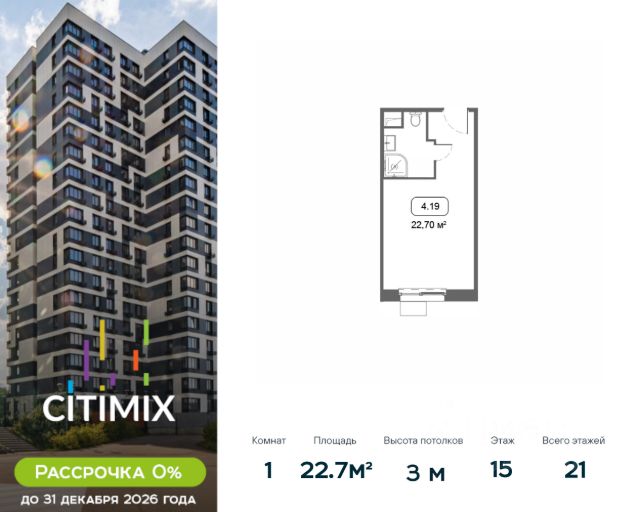 Продаётся студия в корпусе 5, общей площадью 21.97 м², на 18 этаже. Строительство корпуса завершено. Срок ввода — июль 2026 года. В 2026 году запланирован перевод корпуса в жилой фонд, что позволит собственникам оформить постоянную регистрацию в Москве. МФК "CITIMIX" — студии комфорт-класса, расположенные в районе Тропарёво-Никулино в Западном административном округе Москвы. Комплекс включает в себя пять 21-этажных корпусов и собственный парк между ними. Архитектурный облик комплекса, разработанный бюро "ADM", выполнен в современном стиле, а для наружной отделки, уникальной для каждого здания, использовались керамогранитные плиты разных оттенков, витражное остекление и натуральный камень. Все студии в новостройке оснащены современным оборудованием, включая счетчики с возможностью автоматического сбора данных. Во всех подъездах спроектированы уютные лобби-зоны и индивидуальные кладовые. Наличие обширного паркинга, где могут разместиться более 650 автомобилей, позволит закрыть зеленый дворик новостройки для проезда машин и обеспечить жителям уютное, комфортное пространство для семейного отдыха. Первые этажи займут коммерческие помещения, предназначенные для социально-бытовых объектов. В 10 минутах ходьбы расположен парк Школьников, на территории которого есть Очаковские пруды и протекает река Очаковка. В пешей доступности расположен еще один зеленый массив - Тропарёвский лесопарк, занимающий площадь в 218 га. Здесь проложены дорожки для велосипедистов, роллеров и бегунов, обустроены детские площадки и зоны отдыха. Рядом с комплексом находятся детские сады, школа, медклиника, центр развития ребенка, магазины, кафе и отделения банков. Идеальный вариант для студентов, т.к. City-комплекс расположен с такими университетами, как: РАНХиГС, РУДН, РТУ МИРЭА и РНИМУ им. Н.И. Пирогова. МФК "CITIMIX" находится в 1,5 км от станции метро "Озерная" и 2,4 км от станции метро "Юго-Западная. Автомобилистам будет удобно воспользоваться выездом на МКАД (3,2 км). Застройщиком квартала выступает компания APSIS GLOBE, основанная в 2008 году. В качестве девелопера компания успешно завершила ряд инфраструктурных, коммерческих объектов на территории Московской области, Москвы, Санкт-Петербурга.