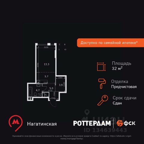 Прямая продажа от застройщика! Жилой Комплекс бизнес-класса на набережной возле Нагатинского причала. Продаётся квартира-студия номер 190 общей площадью 27 кв.м. на 27-м этаже 29 этажного здания. Предчистовая отделка. Цена с учётом скидки. Особенности квартиры: - Организуем показ в удобное для вас время! - Линейная планировка - максимальная функциональность и удобство. - Линейная планировка - максимальная функциональность и удобство. - Увеличенная ширина окна/окон - больше света и визуального простора. - Гардеробная - удобство для хранения и организации вещей. Квартира с предчистовой отделкой. Вам не придется заниматься черновыми и трудоёмкими работы, а чистовую отделку и дизайн - сделайте на свой вкус. Информация о комплексе: ЖК "Роттердам": идеальная транспортная доступность для любого настроения. Пешая доступность до метро, удобный выезд на Варшавское шоссе к ТТК и Садовому кольцу, а также живописная Нагатинская набережная с маршрутом до Кремля. Выбирайте метро, автомобиль, трамвай или велопрогулки вдоль реки - всё под рукой. Транспортная доступность: Всего в 5 минутах пешком до метро Нагатинская и 8 минутах от МЦК Верхние Котлы. Рядом Аэроэкспресс до метро Домодево. До ТТК 2,2 км и 4,9 км до Садового кольца. Внутренняя инфраструктура: ЖК "Роттердам": идеальный баланс работы и отдыха на Нагатинской набережной. Коворкинги, детские площадки и игровой центр для всей семьи. Рядом - 5 парков, спортивные и деловые центры в шаговой доступности. Архитектура сочетает высотные и малоэтажные здания без ощущения "каменных джунглей". Панорамные виды из окон верхних этажей и прямой выход к Москве-реке. Уединённость, безопасность и комфорт для тех, кто ценит личное пространство и время. Квартира с предчистовой отделкой - ваш дизайн без черновых работ