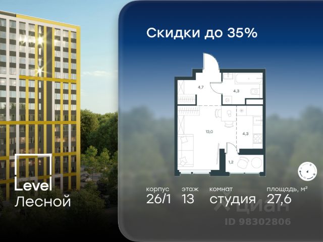 В районе, утопающем в густой зелени лесов, многочисленных парков и скверов, продаётся студия площадью 30.90 кв.м с отделкой white box. Квартира расположена на 8 этаже в жилом комплексе комфорт-класса Level Лесной (компания Level Group/Левел групп).