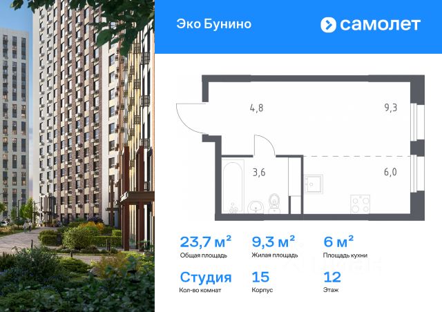 Строим кварталы для жизни с заботой о будущем. Предлагается квартира студия комфорт-класса 23,7 кв.м в корпусе 15 на 12 этаже, в ЖК "Эко Бунино" Квартира с чистовой отделкой. Доступность дополнительных опций уточняйте у застройщика. Приобрести квартиру возможно по специальным акциям от застройщика, с текущими условиями акций можно ознакомиться в блоке "Акций". Цена динамическая и может отличаться, уточняйте актуальность у застройщика. "Эко Бунино" — жилой комплекс в Новой Москве, полностью готовый для жизни. Уже построены школа и детские сады, открыты ледовая арена и магазины. Рядом — 2 станции метро и 3 лесопарка для прогулок. До станции метро "Новомосковская" — 20 минут пешком по экотропе. Во дворах-парках, закрытых от машин, комфортно и безопасно гулять. Здесь высажены уже взрослые деревья, которые создают прохладную тень в жаркий день. Ребенок любого возраста найдет увлекательное занятие в уже готовом плейхабе с большой горкой в виде слона и уникальным игровым оборудованием. Пока дети играют, родители могут прогуляться по бульвару или отдохнуть под навесом из растений. "Эко Бунино" — это 19 монолитных домов переменной этажности. Для облицовки используется навесной вентилируемый фасад и клинкерная плитка, которая имитирует кирпич. Переменная этажность обеспечивает хорошую инсоляцию дворов: в солнечные дни на территории особенно приятно гулять. квартира-студия в новостройке с отделкой в поселении Сосенское в Москве.