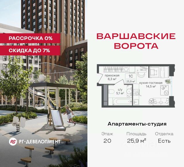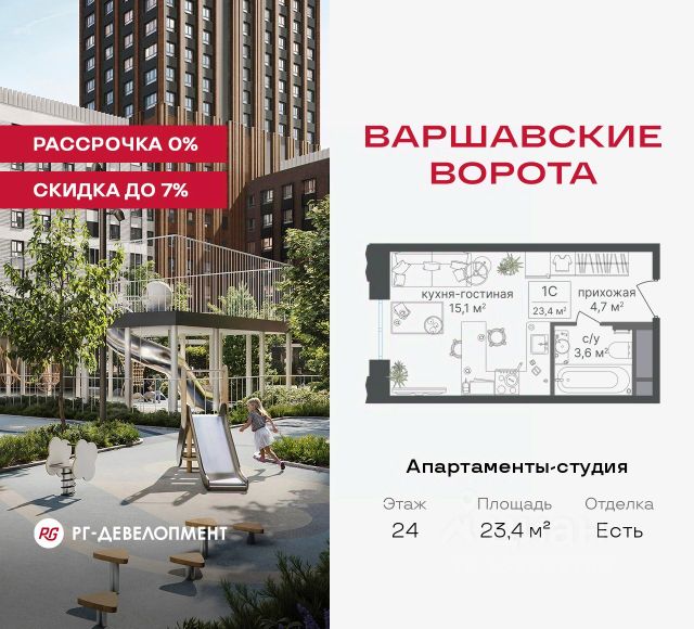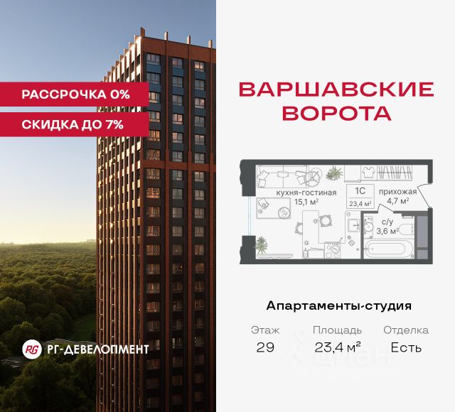 Рассрочка 0% + скидка 5%. Первый платёж 50% при ДДУ, второй 50% — через 12 мес. до ввода ЖК. Продаются Апартаменты-студия 29,6 кв.м. в МФК "Варшавские ворота" на 3-м этаже 30 этажного дома. МФК "Варшавские ворота" — это проект, в котором учтен широкий спектр требований: от транспортной доступности и развитой инфраструктуры до архитектурной выразительности и экологического окружения. Апартаменты в МФК "Варшавские ворота" подойдут для тех, кто ищет продуманное жилье в Москве или готовый инвестиционный актив. Апартаменты здесь — это: - возможность жить комфортно в удобном городском формате — с природой, метро, сервисом и паркингом; - возможность купить лот с готовой отделкой, чтобы вложить минимальные инвестиции в ремонт и получить максимум возможностей от сдачи; - экономия на налоге на имущество, кадастровая стоимость апартаментов ниже ~ на 30% кадастровой стоимости квартиры; - высокая инвестиционная доходность объекта за счет более низкой цены покупки по сравнению с квартирой. Коротко о важном: - 1 минута пешком от м. Аннино; - Удобные выезды на Варшавское шоссе и МКАД; - Вид из окон на Битцевский лес и Аннинский лесопарк; - Высота потолков 2,7 - 3 м; - Закрытый двор-парк; - Школы и детские сады в 10-15 минутах пешком от дома; - Технические лоджии для размещения кондиционеров; - Подземный паркинг; - РГ-Девелопмент — ТОП-20 крупнейших застройщиков России. Проект сочетает в себе современную архитектуру и продуманное благоустройство с уникальным природным окружением. Всего в нескольких минутах от дома — девять парков, каскад прудов и крупнейшие лесопарковые зоны Москвы, создающие ощущение жизни в зеленом оазисе посреди мегаполиса. Архитектурная концепция - стиль Чикаго в Москве. Выполнена в минималистичной эстетике с использованием клинкера и декоративного кирпича. Фасады подчеркивают строгие линии и современный стиль, а входные группы разработаны московским бюро Syntaxis. Лобби оформлены с применением керамогранита, декоративной штукатурки и гипсовых панелей, детали из латуни добавляют изысканности. Пространство оживляют гербарии, композиции из сухоцветов и авторские панно. Проект находится в одной минуте пешком от метро "Аннино", в 12 минутах от станции "Улица Академика Янгеля" и рядом с МЦД-2 "Красный Строитель". Для автомобилистов предусмотрен прямой выезд на Варшавское шоссе и два съезда на МКАД, что позволяет быстро добираться в любую часть города. Среди планировочных решений представлены разнообразные форматы: от функциональных студий до просторных 4-комнатных квартир и апартаментов площадью от 22 до 105 м². Высокие потолки усиливают ощущение простора, а продуманные планировки включают мастер-спальни, гардеробные, угловые окна, объединённые кухни-гостиные и несколько санузлов. Центральное пространство комплекса — закрытый двор без машин. Он разделён на функциональные зоны: детские игровые комплексы, спортивные площадки, воркаут-зоны и уютные места для тихого отдыха. На первых этажах разместятся