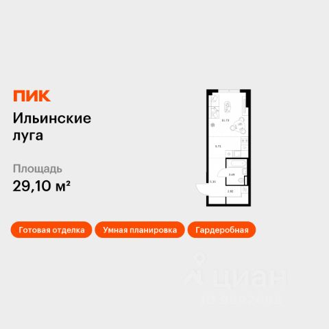 Продаётся квартира-студия площадью 29,1 кв.м на 9 этаже 9 этажного дома (Корпус 4.1, Секция 4) проекта ПИК Ильинские луга. Светлый просторный подъезд на уровне земли, функциональная планировка, большие окна, c отделкой. Жилой район "Ильинские луга" находится в 10 километрах от МКАД по Новорижскому шоссе, в 20 минутах на автомобиле от станций метро "Волоколамская", "Тушинская" и "Строгино". В будущем ближе к проекту, в 9 минутах пути на машине, откроется станция "Ильинская" Рублёво-Архангельской линии, которая будет соединять Арбатско-Покровскую линию и Большую кольцевую линию. Сейчас в квартале начались продажи в корпусах 3.2, 3.3, 3.4, 3.5 и 3.6. "Ильинские луга" — масштабный проект, в который входит девять детских садов, четыре школы и поликлиника. Он строится в престижном и экологичном районе среди лесов и памятников природы. За 5 минут от жилого квартала можно доехать до Рублёво-Успенского шоссе, а за 30 минут — до центра Москвы. До крупного торгового центра "РИГАМОЛЛ" всего 5 минут на автомобиле, а до ТЦ "Твой дом" и гипермаркета "Глобус" — 10 минут. В "Ильинских лугах" строятся только девятиэтажные дома — такая архитектура соответствует спокойной жизни за городом. В каждом дворе-парке есть места для отдыха, детские и спортивные площадки. А ещё, здесь уже открыт большой PlayHub "Гравити" — современное игровое пространство с космической тематикой, холмами, зонами для игр и отдыха жителей любого возраста. На первых этажах уже работают магазины, кафе и пекарни. Места для отдыха от "Ильинских лугов" тоже недалеко: 10 минут на машине — и вы в музее-усадьбе "Архангельское". Также рядом находится Лохин остров — памятник природы, где водятся речные черепахи, есть места для кемпинга и возможность сплавиться по реке. Артикул 1016122 (Застройщик ООО "СЗ "ГРАДОЛИМП")