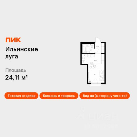 Продаётся квартира-студия площадью 24,11 кв.м на 6 этаже 9 этажного дома (Корпус 4.1, Секция 1) проекта ПИК Ильинские луга. Светлый просторный подъезд на уровне земли, функциональная планировка, большие окна, c отделкой. Жилой район "Ильинские луга" находится в 10 километрах от МКАД по Новорижскому шоссе, в 20 минутах на автомобиле от станций метро "Волоколамская", "Тушинская" и "Строгино". В будущем ближе к проекту, в 9 минутах пути на машине, откроется станция "Ильинская" Рублёво-Архангельской линии, которая будет соединять Арбатско-Покровскую линию и Большую кольцевую линию. Сейчас в квартале начались продажи в корпусах 3.2, 3.3, 3.4, 3.5 и 3.6. "Ильинские луга" — масштабный проект, в который входит девять детских садов, четыре школы и поликлиника. Он строится в престижном и экологичном районе среди лесов и памятников природы. За 5 минут от жилого квартала можно доехать до Рублёво-Успенского шоссе, а за 30 минут — до центра Москвы. До крупного торгового центра "РИГАМОЛЛ" всего 5 минут на автомобиле, а до ТЦ "Твой дом" и гипермаркета "Глобус" — 10 минут. В "Ильинских лугах" строятся только девятиэтажные дома — такая архитектура соответствует спокойной жизни за городом. В каждом дворе-парке есть места для отдыха, детские и спортивные площадки. А ещё, здесь уже открыт большой PlayHub "Гравити" — современное игровое пространство с космической тематикой, холмами, зонами для игр и отдыха жителей любого возраста. На первых этажах уже работают магазины, кафе и пекарни. Места для отдыха от "Ильинских лугов" тоже недалеко: 10 минут на машине — и вы в музее-усадьбе "Архангельское". Также рядом находится Лохин остров — памятник природы, где водятся речные черепахи, есть места для кемпинга и возможность сплавиться по реке. Артикул 1015748 (Застройщик ООО "СЗ "ГРАДОЛИМП")