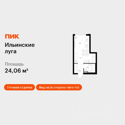 Продаётся квартира-студия площадью 24,06 кв.м на 9 этаже 9 этажного дома (Корпус 4.2, Секция 2) проекта ПИК Ильинские луга. Светлый просторный подъезд на уровне земли, функциональная планировка, большие окна, c отделкой. Жилой район "Ильинские луга" находится в 10 километрах от МКАД по Новорижскому шоссе, в 20 минутах на автомобиле от станций метро "Волоколамская", "Тушинская" и "Строгино". В будущем ближе к проекту, в 9 минутах пути на машине, откроется станция "Ильинская" Рублёво-Архангельской линии, которая будет соединять Арбатско-Покровскую линию и Большую кольцевую линию. Сейчас в квартале начались продажи в корпусах 3.2, 3.3, 3.4, 3.5 и 3.6. "Ильинские луга" — масштабный проект, в который входит девять детских садов, четыре школы и поликлиника. Он строится в престижном и экологичном районе среди лесов и памятников природы. За 5 минут от жилого квартала можно доехать до Рублёво-Успенского шоссе, а за 30 минут — до центра Москвы. До крупного торгового центра "РИГАМОЛЛ" всего 5 минут на автомобиле, а до ТЦ "Твой дом" и гипермаркета "Глобус" — 10 минут. В "Ильинских лугах" строятся только девятиэтажные дома — такая архитектура соответствует спокойной жизни за городом. В каждом дворе-парке есть места для отдыха, детские и спортивные площадки. А ещё, здесь уже открыт большой PlayHub "Гравити" — современное игровое пространство с космической тематикой, холмами, зонами для игр и отдыха жителей любого возраста. На первых этажах уже работают магазины, кафе и пекарни. Места для отдыха от "Ильинских лугов" тоже недалеко: 10 минут на машине — и вы в музее-усадьбе "Архангельское". Также рядом находится Лохин остров — памятник природы, где водятся речные черепахи, есть места для кемпинга и возможность сплавиться по реке. Артикул 1015499 (Застройщик ООО "СЗ "ГРАДОЛИМП")
