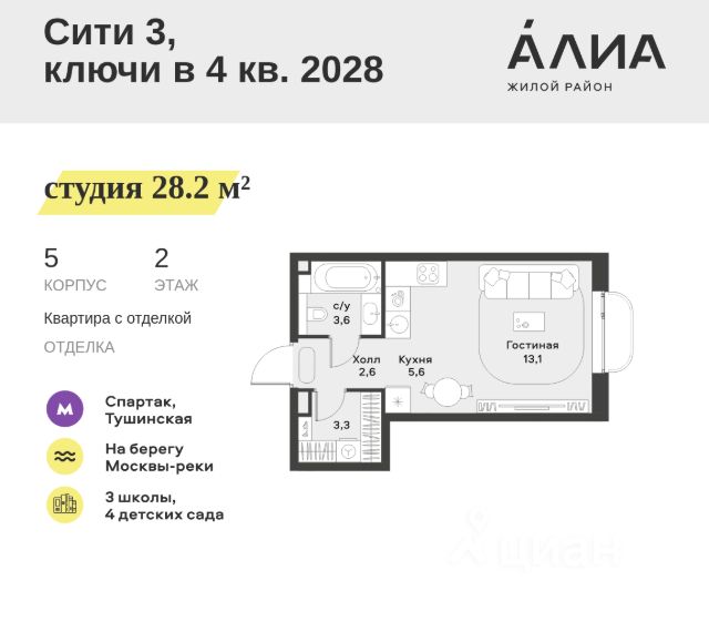 Продаётся Студия 22.4 м². В жилом районе Алиа на 12-м этаже 28-этажного дома. Жилой район Алиа — это дома бизнес-класса у слияния Москвы-реки и Сходни. Алиа находится в Покровском-Стрешневе, экологически чистом районе на престижном северо-западе столицы. Район возводится на бывшей территории Тушинского аэрополя, где никогда не было промышленного производства. Алиа — это район разностороннего развития, спроектированный по принципу WORK.LIVE.PLAY.LEARN. Это "15-минутный город", где вся необходимая для комфортной жизни инфраструктура — на расстоянии приятной прогулки. У района удобное расположение: отсюда меньше 10 минут пешком до станций метро "Спартак" и "Тушинская" и всего полчаса на автомобиле до центра города или аэропорта Шереметьево. Архитектурную концепцию Алиа разработало бюро SOM (Skidmore, Owings & Merrill), авторы знаменитой "Бурдж-Халифа". В Алиа больше 140 планировочных решений, среди которых — редкие для Москвы форматы: квартиры с окном в ванной, пентхаус, сити-юниты и таунхаусы. Почти половина территории района отдана под благоустройство. В Алиа три парка: Линейный парк с кафе и магазинами, Центральный парк с амфитеатром, сухим фонтаном и большим плейхабом для детей всех возрастов и Прибрежный парк на собственной набережной, одной из самых длинных в Москве. В каждом урбан-блоке — закрытый внутренний двор с гипоаллергенными растениями и детской площадкой. В лобби каждого жилого корпуса в Алиа оборудована зона ожидания, колясочная, гостевой санузел и лапомойка для домашних животных. За стойкой ресепшена резидентов и их гостей встречает консьерж. Центральное лобби урбан-блока — это стильное общественное пространство с коворкингом, лаундж-зоной и кофе-пойнтом. Это "вторая гостиная" жителей урбан-блока и одно из мест, где формируется комьюнити Алиа. Два ключевых объекта инфраструктуры в Алиа — это спорткомплекс "Чкалов Арена", где представлены 25 видов спорта, и самый большой в стране бизнес-парк класса A, благодаря которому району обеспечено быстрое развитие.
