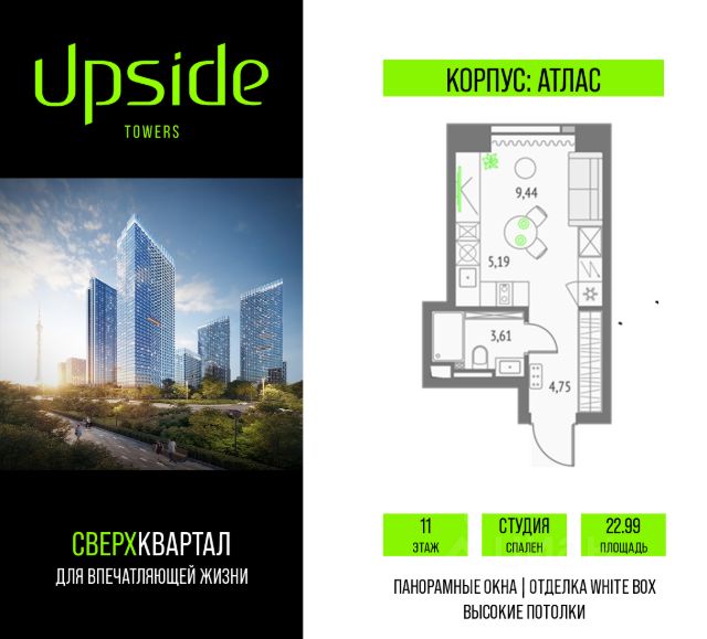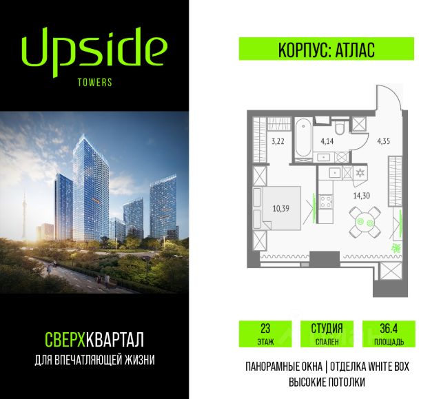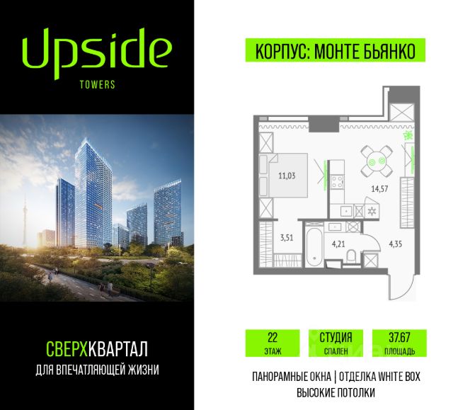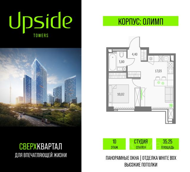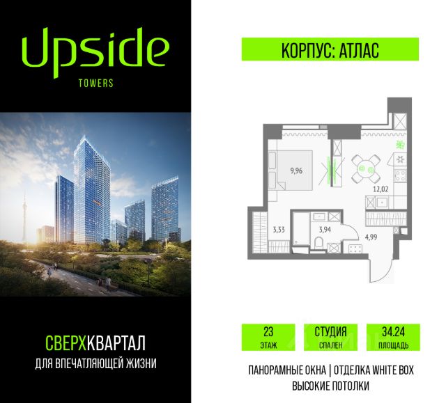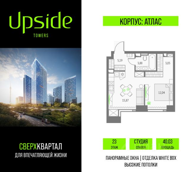 Продаётся студия площадью 33.39 кв.м на 3 этаже 19 этажного корпуса Олимп в квартале небоскребов "Upside Towers". В квартире отделка White-box, c видом на корпус Атлас, корпус Эльбрус, Гранд-плаза,. Номер квартиры В0301. Upside Towers - технологичный квартал строится в динамично развивающемся Бутырском районе, в 3 мин. от метро, в 5 мин. от ТТК. На территории 7 га возводится 5 высотных башен от 19 до 58 этажей, названных в честь главных вершин земли. Квартиры с панорамными окнами в пол, высокими потолками и современными инженерными решениями. Благоустроенная зеленая территория включает: приватные дворы, природный комплекс, прогулочный бульвар, ландшафтный парк 2,5 га с сенсорным садом и многофункциональными игровыми и спортивными площадками. В корпусе откроются магазины, кафе и рестораны, а также другие объекты коммерческой инфраструктуры. Большое внимание в проекте уделяется созданию социальной инфраструктуры. Между "Атласом" и "Олимпом" в трехэтажном стилобате разместится уникальное пространство закрытый клуб для жителей квартала Upside Club площадью 2 000 кв. м. Здесь разместятся: каминный зал с роялем, многофункциональная детская зона c двухуровневым игровым оборудованием для малышей и дошкольников, плей-рум для подростков, домашний кинотеатр, коворкинг, переговорные и лектории. На 47 этаже башни "Атлас" откроется SKY SPA Relax с расслабляющей атмосферой, джакузи, сауной, залами для релаксации и йоги. Собственники квартир смогут в любое удобное для них время забронировать посещение спа-зоны через смарт-приложение. На крыше стилобата разместится всесезонная BBQ патио-зона с верандой и закрытыми помещениями для приготовления и отдыха. В башнях откроются смотровые террасы для резидентов с панорамными видами на город, парки, Останкинскую башню, ВДНХ, Ботанический сад и Москву-Сити. Покупая квартиру даже самого минимального размера в Upside Towers, вы получаете в пользование 2 000 м² бесплатных общественных пространств. В рамках проекта строится государственная школа и детский сад, разместится более 15 000 кв.м. коммерческой инфраструктуры. Насыщенная социальная инфраструктура формирует множество сценариев для жизни на территории квартала. В Upside Towers применяются лучшие технологии и практики, чтобы обеспечить высшее качество жизни: Воздух, не уступающий по качеству горному, обеспечит приточно-вытяжная вентиляция. Пятиступенчатая очистка воды с сохранением полезных минералов. Центральное кондиционирование. Внутрипольные конвекторы с естественной конвекцией. Современные системы безопасности и мониторинга микроклимата. Высокоскоростной интернет на всей территории, в квартирах и паркинге за счет усиления GSM-связи всех ведущих операторов. Все места в подземном паркинге оборудованы зарядками для электрокаров. Бутырский район непрерывно развивается и готовится стать новым современным деловым районом Москвы. В рамках программы "Индустриальные кварталы" комплексного развития территории Огородного проезда будут построены современные обра Купить квартиру-студию от застройщика в районе Бутырский в Москве.