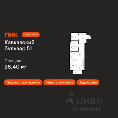 Продаётся квартира-студия площадью 28,4 кв.м на 13 этаже 24 этажного дома (Корпус 3.5, Секция 2) проекта ПИК Кавказский бульвар 51. Светлый просторный подъезд на уровне земли, функциональная планировка, большие окна, предчистовая отделка. "Кавказский бульвар 51" — современный жилой квартал в районе Царицыно. Проект частично реализован и находится в районе Царицыно, недалеко от одноимённого музея-заповедника. До метро "Кантемировская" — 17 минут пешком. За 20 можно дойти до станции "Чертаново". В 10 минутах на машине — МКАД, в 11 минутах — Варшавское шоссе, а в 16 минутах — ТТК. В проекте жилые дома высотой от 5 до 33 этажей, детский сад и школа. На первых этажах доступны магазины, кафе, салоны красоты и другие сервисы — чтобы купить кофе и свежий хлеб к завтраку, можно просто спуститься на лифте. В уютных дворах-парках есть места для отдыха и детские площадки. Для прогулок на свежем воздухе мы построим для жителей широкий пешеходный бульвар. В районе вокруг "Кавказского бульвара 51" есть всё для комфортной жизни: детские сады, школы, поликлиники, магазины и торговые центры. Девять минут на машине — и вы у музея-заповедника "Царицыно", где можно гулять среди исторических построек, лежать на траве под тенью деревьев или заниматься спортом на специальных площадках. Есть парки и поближе: до Аршиновского можно дойти за 8 минут, а до парка "Сосенки" — за 13 минут. Артикул 998633 (Застройщик АО "СПЕЦИАЛИЗИРОВАННЫЙ ЗАСТРОЙЩИК "ТОРГОВЫЙ ДОМ СПУТНИК")