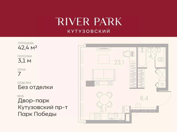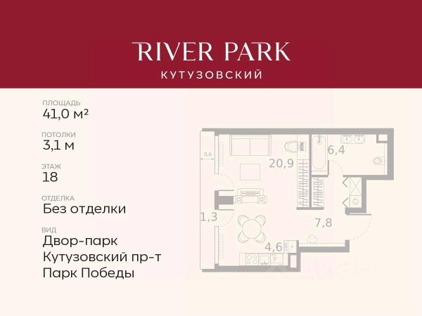 Продается студия площадью 21.3 кв.м. на 2-м этаже в жилом комплексе премиум-класса River Park Кутузовский в Башне Diamond Tower О жилом комплексе. Премиальный жилой комплекс River Park Кутузовский строится в одном из самых престижных районов столицы Дорогомилово, на берегу Москвы-реки. Яркий проект в стиле эко-футуризма станет самым масштабным и самым высотным ЖК в локации Кутузовского проспекта. В проекте будет впервые воплощена концепция Family Premium. Расположение и Транспортная доступность: - На берегу Москвы-реки, напротив Москва-Сити - 600 метров до Кутузовского проспекта - Удобный съезд с ТТК - Прямой выезд на МКАД по Северному дублеру Кутузовского проспекта. - В пешей доступности 3 станции метро: Фили, Парк Победы, Кутузовская, а также станция МЦД Фили. Архитектура от именитого бюро ADM отличается уникальной пластикой фасадов - башни словно парят в воздухе, играя гранями как драгоценные камни. Жилой комплекс состоит из 5-ти небоскребов с home park на закрытой территории и внешней торговой галереей с открытым доступом. В закрытом внутреннем дворе уникальная по насыщенности клубная инфраструктура - 5 Towers Club только для жителей: - Многофункциональная спортивная площадка (баскетбол, футбол, воллейбол, большой теннис) - Детский игровой клуб NEMO - Life Rooms с караоке, барной стойкой и meeting room - Music salon - Gedonist Club с бильярдной - Beauty station - Гольф-симулятор Впервые в Москве lounge зоны на крыше небоскребов, только для жителей: - Всесезонные беседки иглу - Джакузи - Барная стойка - Грили - Площадка для занятий йогой - Самые высоки качели на крыше в России - Видовые площадки Благоустройство комплекса занимает 3 гектара и разработано мировым экспертом по городским парковым ландшафтам - голландским бюро WEST8. Концепция проекта дать жителям отдохнуть от городского ритма, расслабиться среди природы и натуральных материалов. В home park будут высажены многолетние деревья по принципу no allergy. - Зеркальный пруд с арт-объектом - Две детские площадки - Work out с навесом - Цветущий сад - Party lounge - Видовая зона отдыха с очагом - Солярий На территории жилого комплекса планируется строительство крупного образовательного центра: детский сад на 200 мест и школа на 460 мест. Купить квартиру-студию от застройщика рядом с метро Багратионовская.
