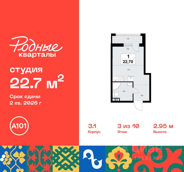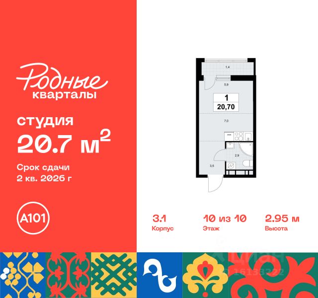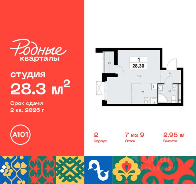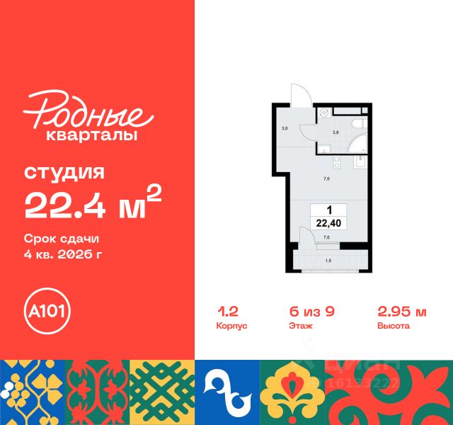 Продается студия 344 в новостройке Жилой район "Родные кварталы" по адресу Москва, ТиНАО, Новомосковский АО, Марушкинское С/П, жилой комплекс Родные Кварталы, 2, район Внуково, Новомосковский административный округ, Москва. Общая площадь квартиры - 24.00 кв. м., этаж 3 из 9, секция 8. Тип проекта, по которому построен дом - монолит, компания-застройщик - ООО "А101". Стоимость квартиры - 8702160 Р. Срок сдачи - 2 квартал 2026. ПРЕДЛОЖЕНИЯ ОТ ЗАСТРОЙЩИКА В ФЕВРАЛЕ 2026: Скидки до 10% на все квартиры. Только в офисах продаж до 28 февраля. Ипотека от 13,9 % для всех! На весь срок. "Семейная ипотека" вернулась. Ставка от 3,5 % на весь срок! Без удорожания! Выгодное ипотечное комбо: Ипотека от 2200 р./мес. и от 6 % после рождения ребёнка! Ипотека для всех "Держи пять!" - ставка 5 % на 2 года! *более подробную информацию по скидкам и акциям уточняйте в отделе продаж ЖК "Родные кварталы" строится в экологически благоприятной локации, рядом с парком Изварино и Ульяновским лесопарком. До станции метро "Аэропорт Внуково" и МЦД "Толстопальцево" - 15 мин. на транспорте. До Боровского, Киевского, Минского шоссе - 3, 6 и 20 минут соответственно Основная концепция благоустройства - воссоздание колорита разных регионов России. Этот же принцип использован в благоустройстве и озеленении района от бюро GAFA. Лесопарк, зоны отдыха, пешеходный бульвар со спуском в виде амфитеатра к набережной и центральной торговой площади, спортивные площадки. В шаговой доступности откроются детские сады и школа, поликлиника. На первых этажах домов - спортклубы, клиники, аптеки, супермаркеты, кафе и многое другое. Цветовые решения лобби также созвучны климатическим зонам России. Здесь появятся зоны ожидания с гостевыми санузлами и колясочными. Предусмотрены подземные паркинги и кладовые. Преимущества "Родных кварталов" - уютная атмосфера "малой родины" - полноценная инфраструктура внутри района - выезд на ключевые шоссе - от 3 минут на автомобиле - малоэтажная застройка