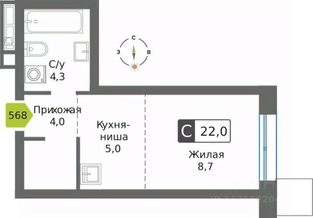 Продаётся студия 778, площадью 21,44 м², на 2 этаже в ЖК "Ильинойс" корпус 3. Стоимость — от 5703978 руб. Квартира без отделки, планировка односторонняя, окна на улицу.