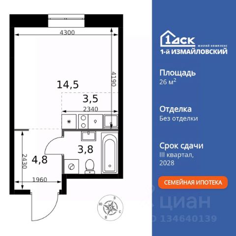 Прямая продажа от застройщика! Жилой Комплекс Комфорт класса. Продаётся квартира-студия номер 625 общей площадью 26.6 кв.м. на 15-м этаже 32 этажного здания. Без отделки. Особенности квартиры: - Линейная планировка - максимальная функциональность и удобство. - Гибкая планировка - создайте пространство по своему вкусу. - Место для игры/занятия спортом - идеальное пространство для активных детей. - Можно оборудовать рабочее место - комфорт для работы и учёбы. - Линейная кухня - функциональность и практичность в одном решении. - Ниша под шкаф - компактное и удобное место для вещей. Информация о комплексе: Современный архитектурный проект "1-й Измайловский" - идеальное место для проживания, расположенное в восточной части Москвы в окружении 14 000 гектаров леса. Комплекс пронизан атмосферой здорового образа жизни и благополучия. Сиреневый сад и близлежащие лесопарки - это места, где можно насладиться лыжными прогулками зимой и тонизирующими пробежками летом. Расположенный между Щелковским шоссе и Амурской улицей, "1-й Измайловский" осмысляет себя не столько через близость к городским точкам притяжения, сколько через соседство с зелеными пространствами и спортивными объектами. Он отгорожен от шоссе застройкой первой линии и собственными садами здоровья. В его окнах - изумрудное море парка "Лосиный остров" и густые кроны окрестных дворов. В его графике - занятия спортом и прогулки в Измайлове. Транспортная доступность: Не более 2,5 км до станций метро "Щёлковская" и "Черкизовская" и МЦК "Локомотив". Щёлковское шоссе соединяет квартал с Северо-восточной хордой и МКАД, Центральным автовокзалом и Восточным железнодорожным вокзалом. Две автобусные остановки в паре минут ходьбы и 11 маршрутов общественного транспорта. На автомобиле 3 минуты до СВХ 12 минут до ТТК 15 минут до Садового кольца Внутренняя инфраструктура: Комплекс находится в исторически сложившемся районе Москвы с хорошим качеством и плотностью инфраструктуры. Торговые центры и сетевые магазины -6 детских садов, включая собственный детский сад на 125 мест -3 школы, включая собственную школу -Поликлиники и медицинские центры -Парки и зоны отдыха Расположение архитектурного проекта создает все условия для тех, кто стремится к здоровому образу жизни и для тех, кто уже сделал выбор в его пользу. В ближайшем окружении расположены несколько стадионов и множество спортивных объектов для занятий спортом на любой вкус: от всеми любимого футбола, баскетбола и до конного спорта. В окружении проекта более 30 километров организованных беговых и велодорожек.